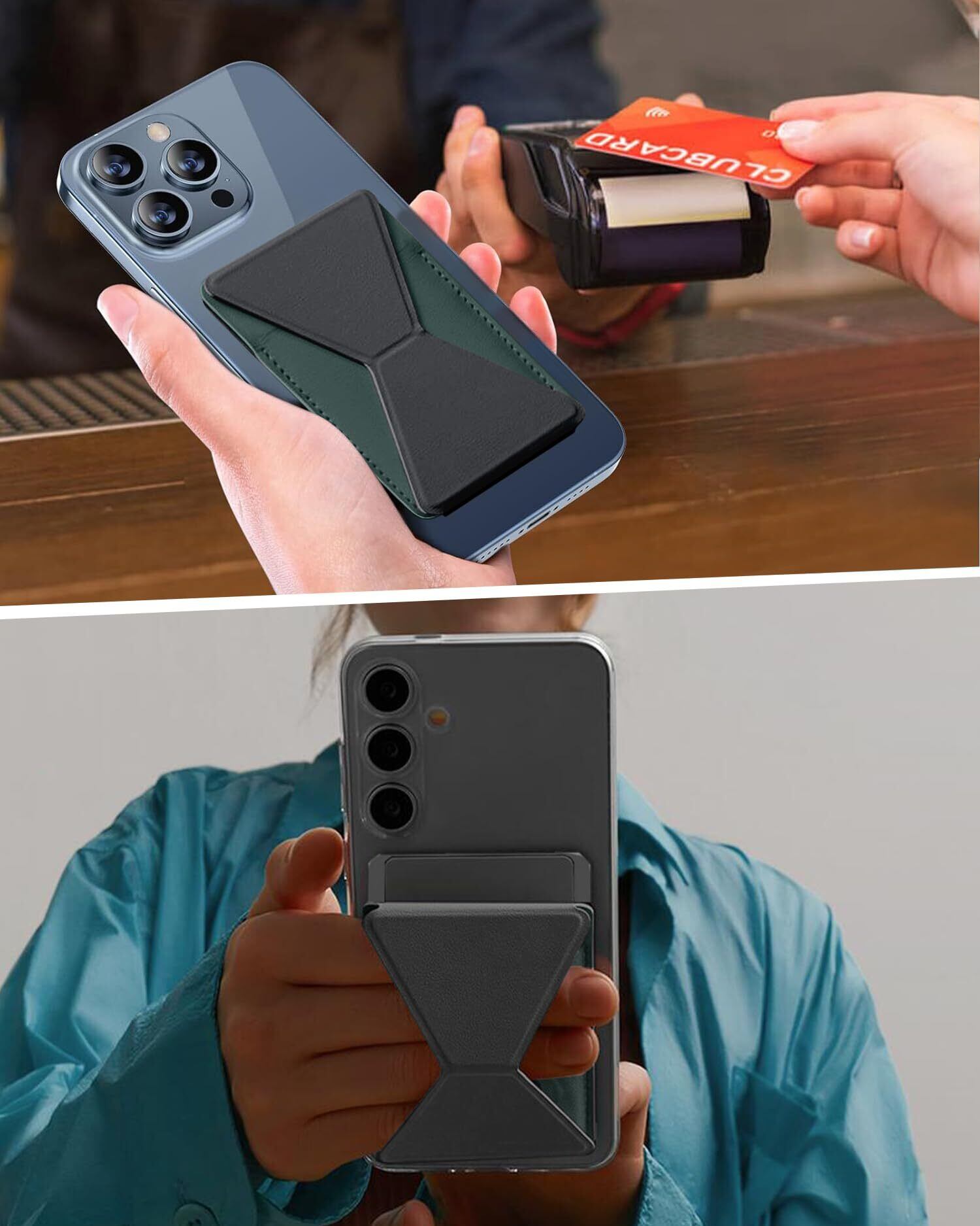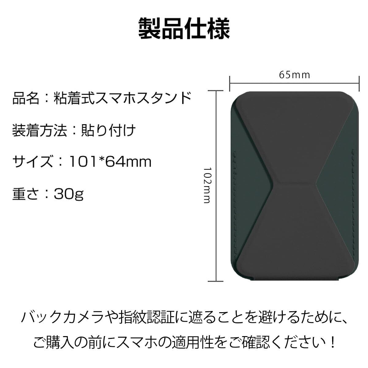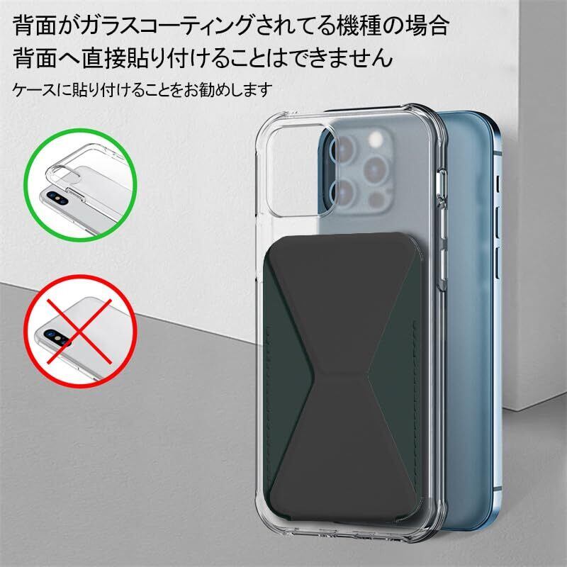 For スマホスタンド カードケース 粘着型 スマホ背面スタンド 手帳型 貼り付け カードポケット カード入れ 背面カード収納 iPhoneカードケース 薄型 軽量 折り畳み式 ホルダー ICカード 落下防止 ヴィーガンレザー 滑り止め iPhone AQUOS Xperia Galaxy など スマートフォン 全機種対応 カードホルダー 角度調整 持ち歩き便利(モスグリーン)