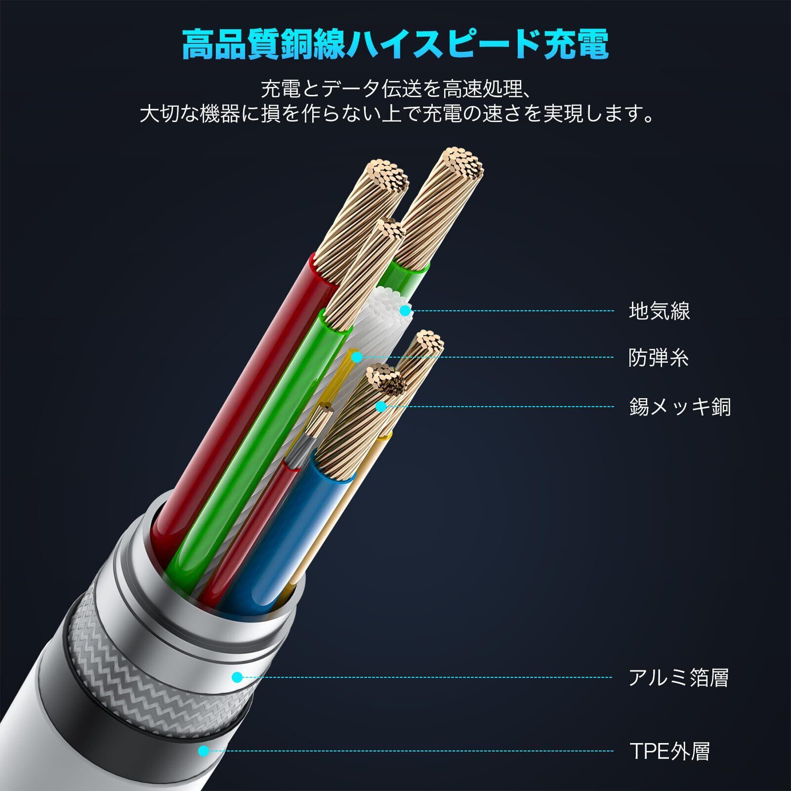 【安全保護】:コネクタ部分にスマートチップが内蔵されているため、接続された端末を自動的に検知し、デバイスに最も良い電流出力で充電します。伝導率の良い銅芯を採用した安全重視設計により、3Aの高出力を流せしかも過充電と発熱などを防ぎます。過電圧、過流、過熱、過電流、ショートや過負荷保護などのの多重保護で、ケーブルの安全性と信頼性を向上させます。