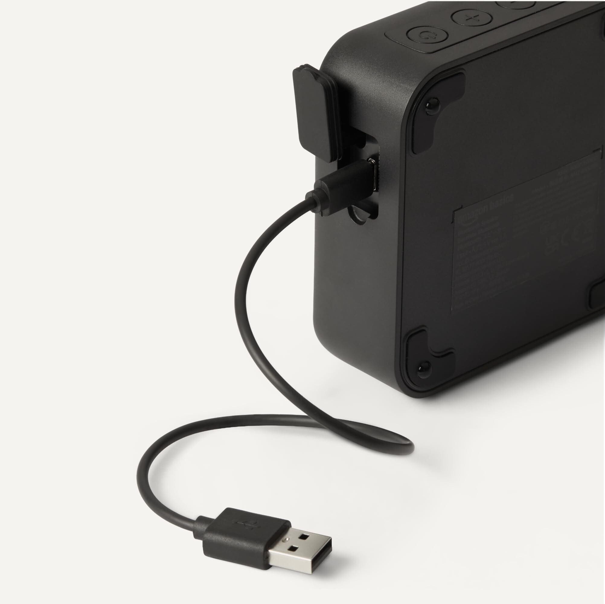 音量50%で最大6時間の連続再生が可能で、急な雨でも安心のIPX5防水仕様。USB-C端子で簡単に充電できます