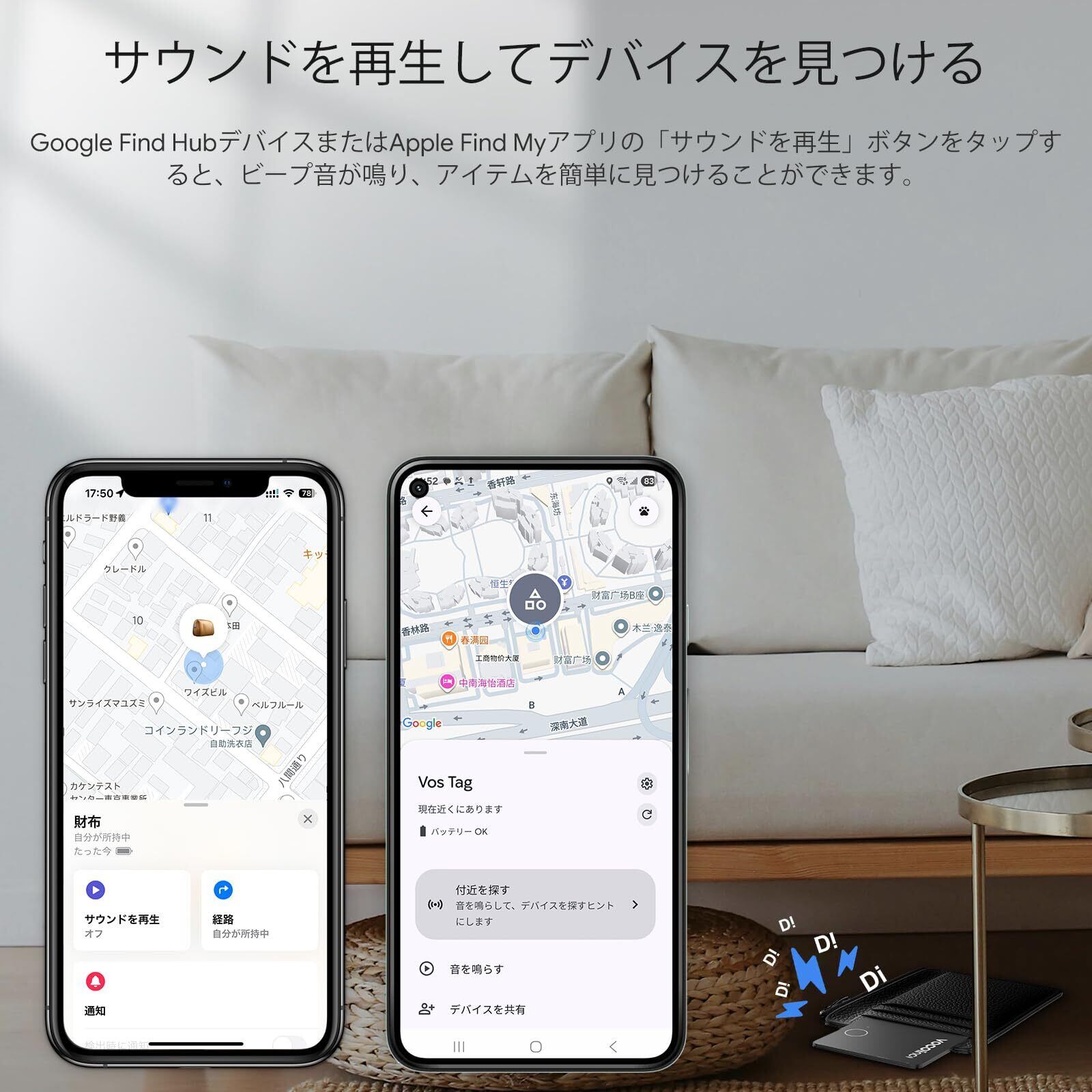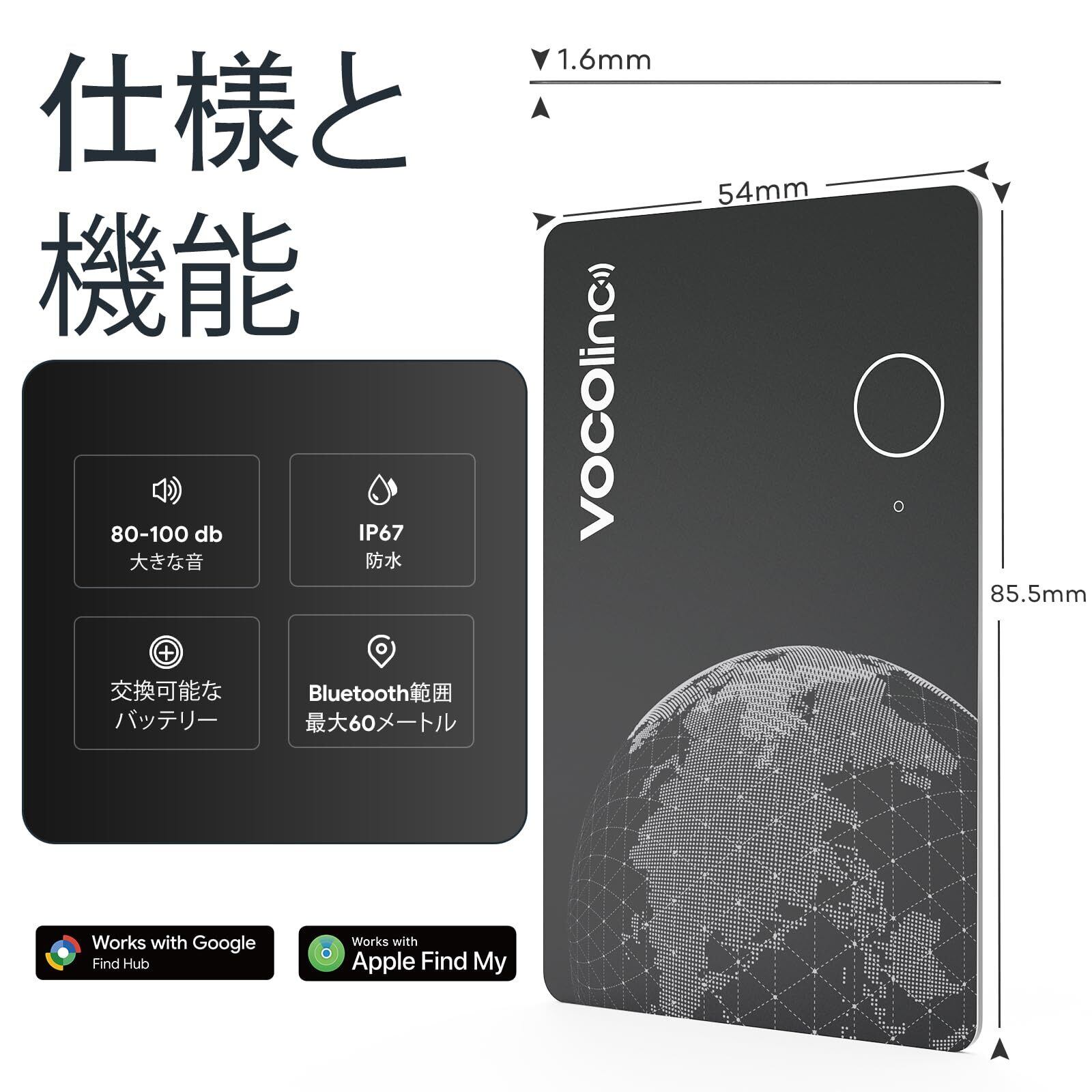 [紛失アラートと紛失モード]:Appleの「探す」アプリからすぐに紛失アラートを受け取ることができるため、紛失を未然に防ぐことができます。(この機能はGoogleのシステムではまだご利用いただけません。)VOCOlinc の位置タグを紛失した場合は、Google Find HubまたはAppleの「探す」アプリで紛失モードをオンにしてください。Appleの「探す」ネットワークがタグを検出すると、自動的に通知が届きます。