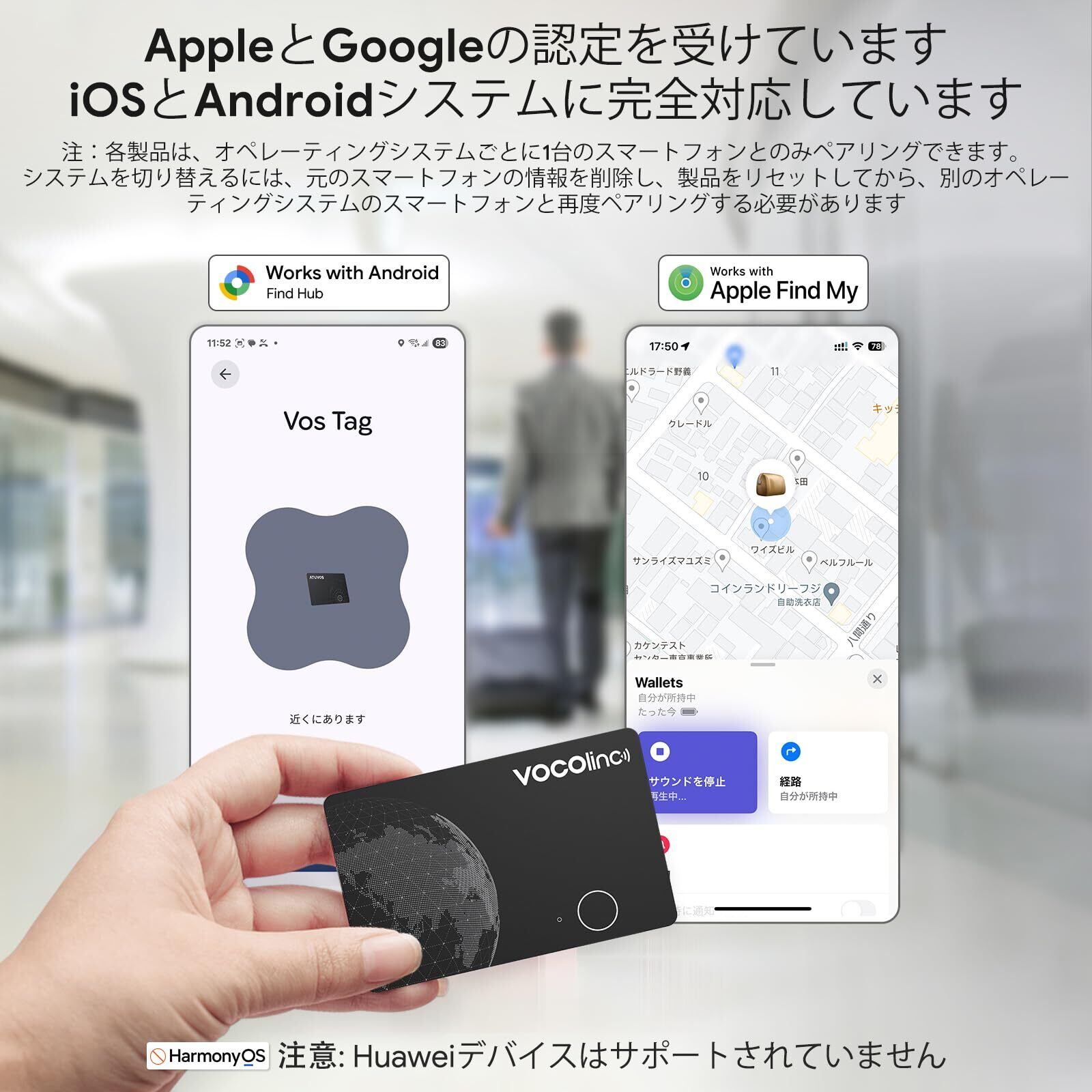 [iOS/Android対応]:VOCOlincエアタグ 強化版 は、iOS(「探す」アプリ経由)およびAndroid(Google Find Hub経由)に対応した、新たにアップグレードされたBluetoothトラッカーです。注:Huawei HarmonyOSには対応していません。VOCOlincタグ 強化版はAppleとGoogleの認定チップを搭載していますが、システムの制限により、一度に1つのシステムにしか接続できません。iOSとAndroidをデュアルスイッチするには、トラッカーのペアリングを解除し、新しいスマートフォンに再接続するだけです。