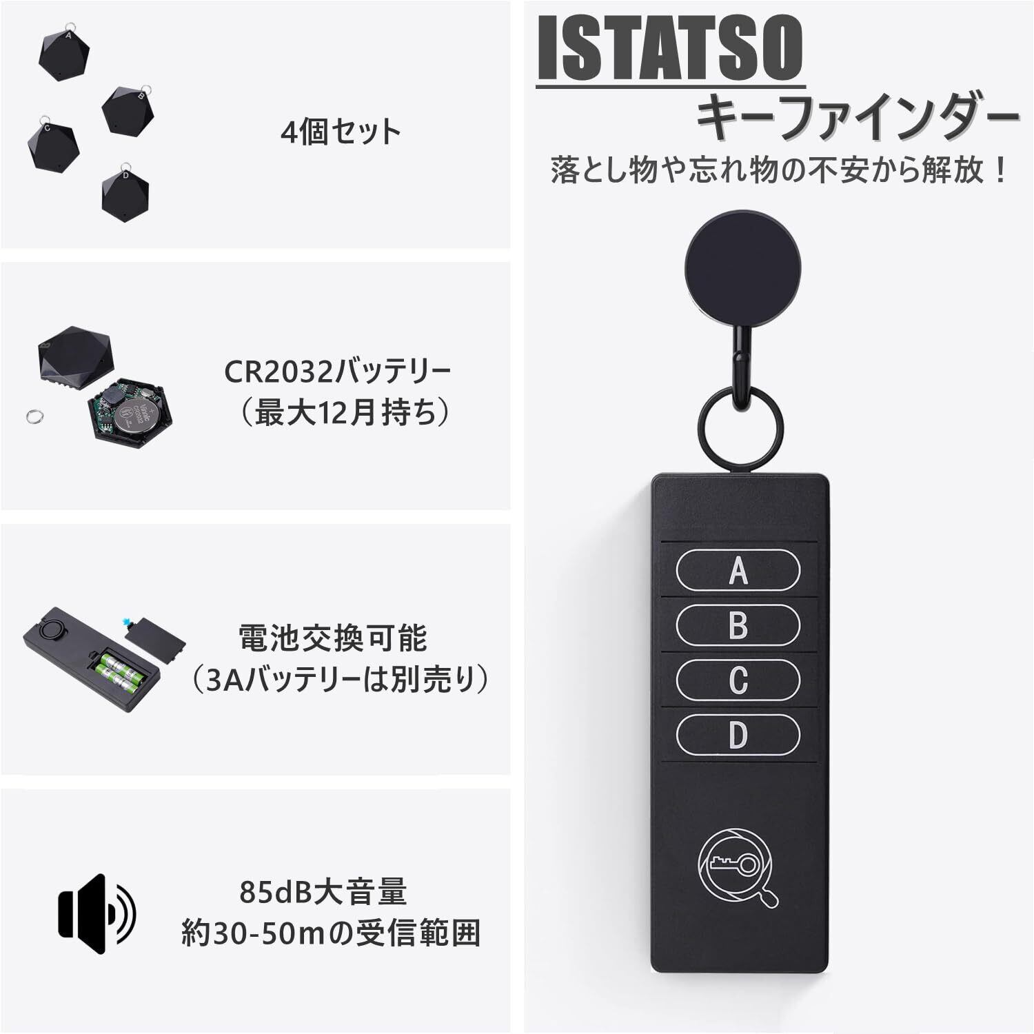 【ISTATSO】キーファインダー 探し物発見器 忘れ物・落し物探知機 探し物キーホルダー key finder 軽量 薄型 耐衝撃 お年寄り·隠す習性の方·物忘れ易い方向け 簡単で使いやすい 鍵/スマホ/カバン/財布/高齢者用ステッキに掛ける 忘れ物防止タグ 日本語説明書付き (4個セット)
