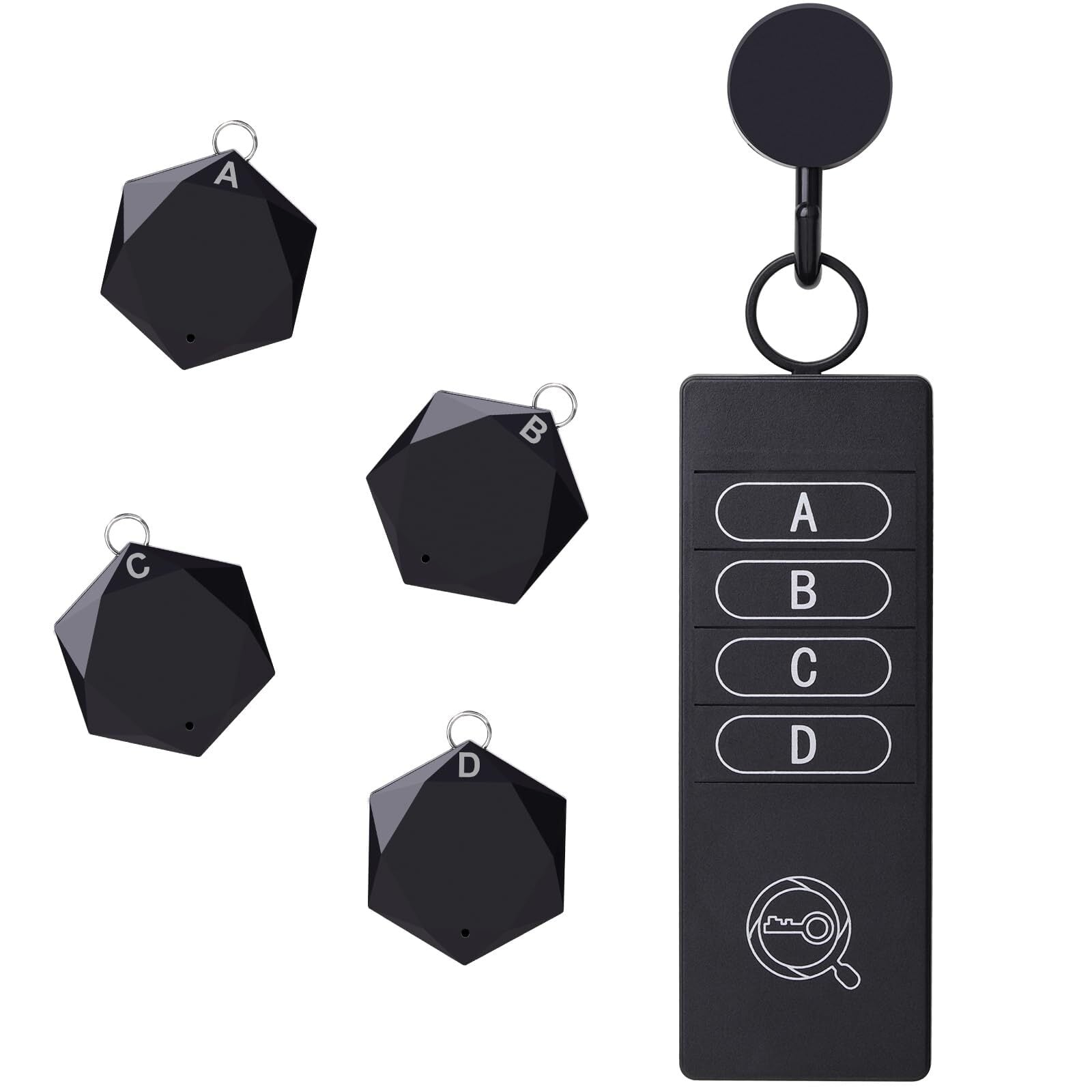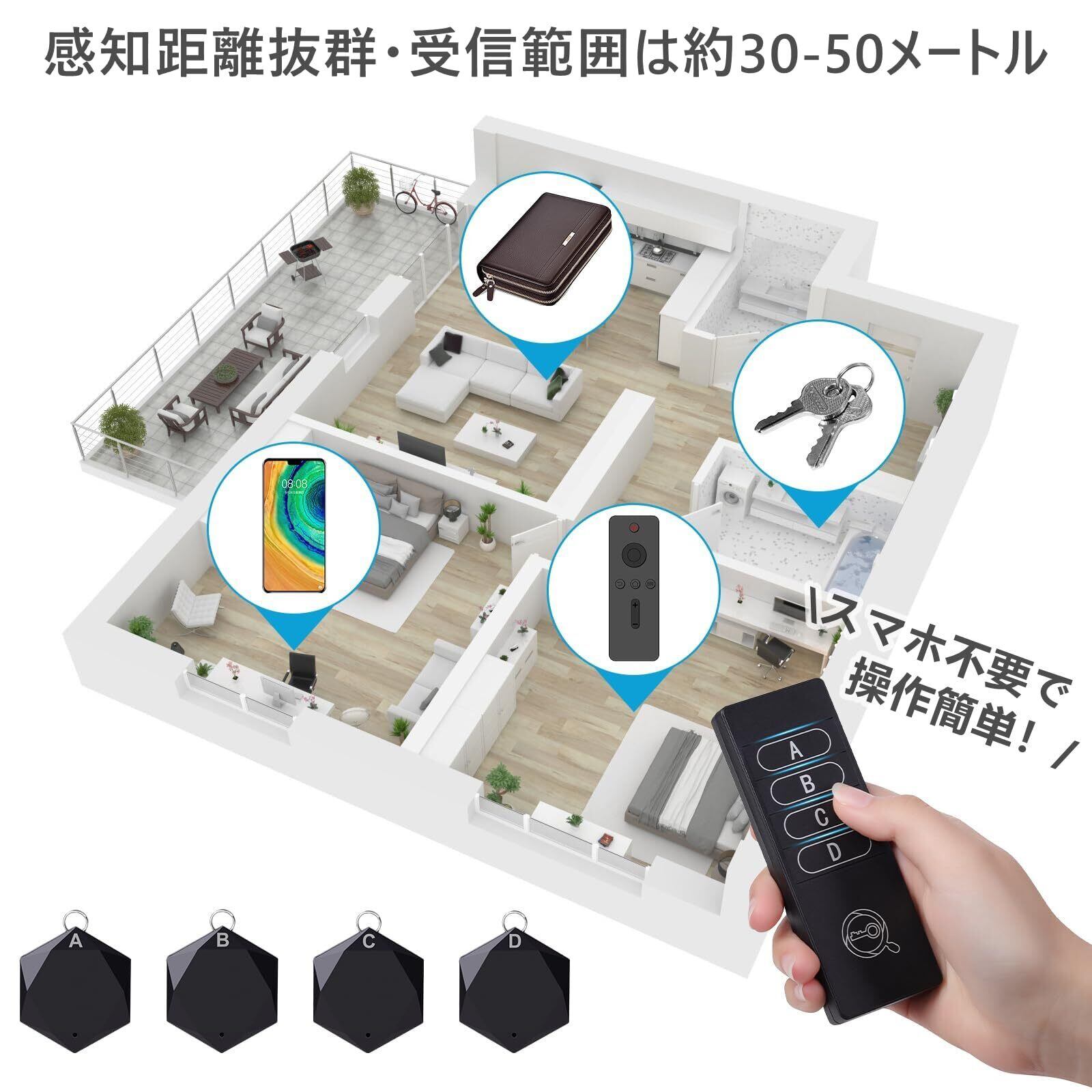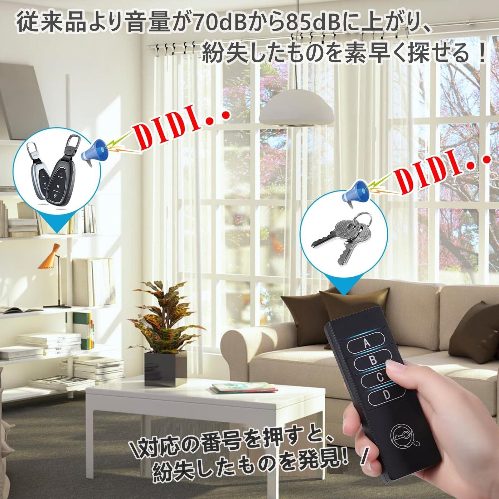 【最新版4in1キーファインダー】送信機(1台)にはA/B/C/Dの番号ボタンがあり、送信機のボタンを押すと同じ番号の受信機(4個)が鳴ります。ワンタッチだけで、うっかり紛失してしまいがちな貴重品を素早く見つけることができるし、落とし物や忘れ物の不安から解放!手のひらに収まる携帯性、シンプルな操作性、違和感なくインテリアに馴染むデザイン性も追求しました。
