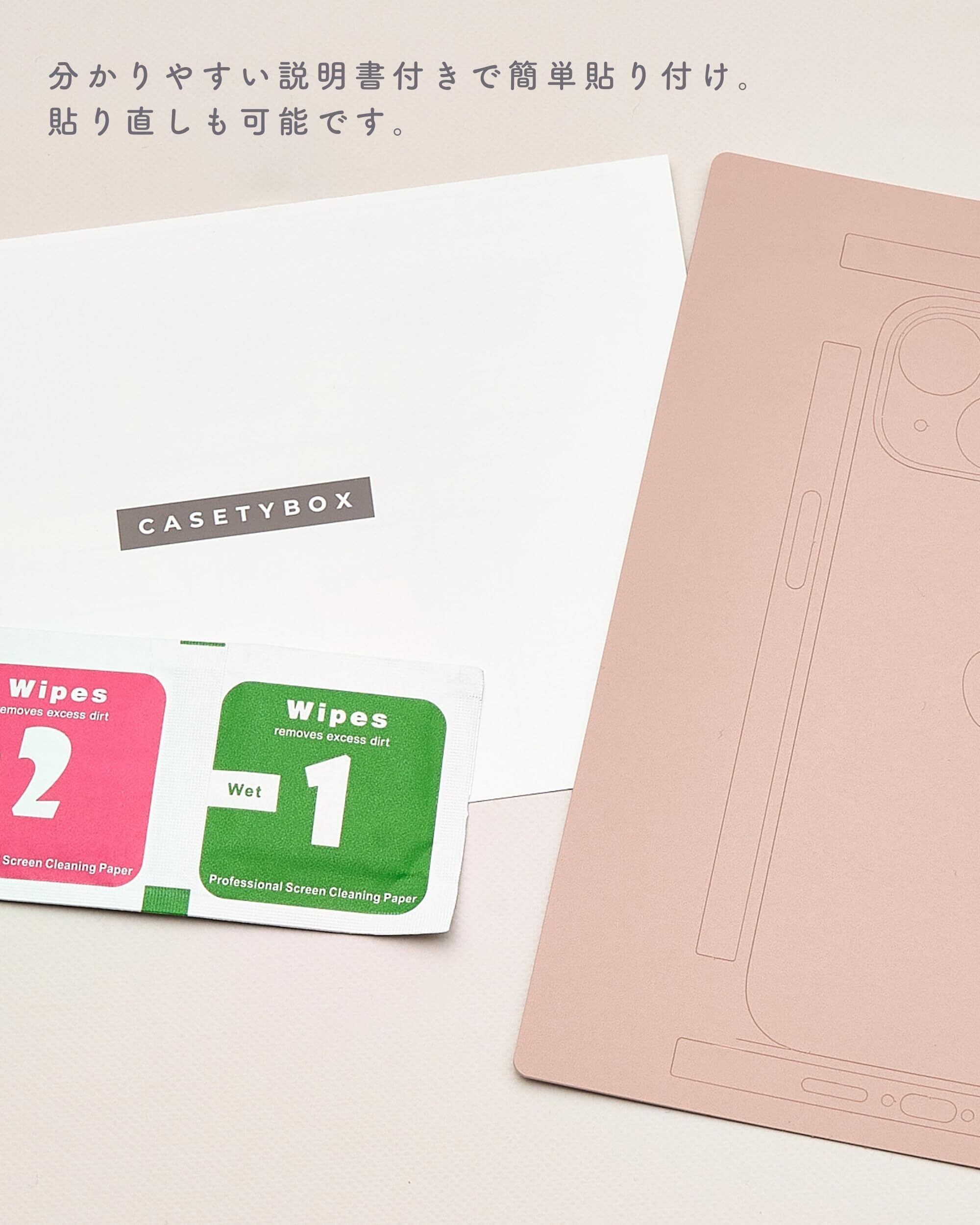 CASETYBOXからiPhone用スキンシールが登場。「iPhoneの色を変えて気分を変えたい」というお声から誕生しました。特殊加工をする事で表面はざらざらとしたマットな質感になっています。一般的なスキンシールは傷防止を主とし薄く加工されていますが、Casetyboxのスキンシールは”触り心地”と”存在感”を意識し、加工をかけています。また、しっかりとした質感を持ちながらもスキンシールの上にクリアケースを使用できるよう厚みになっています。