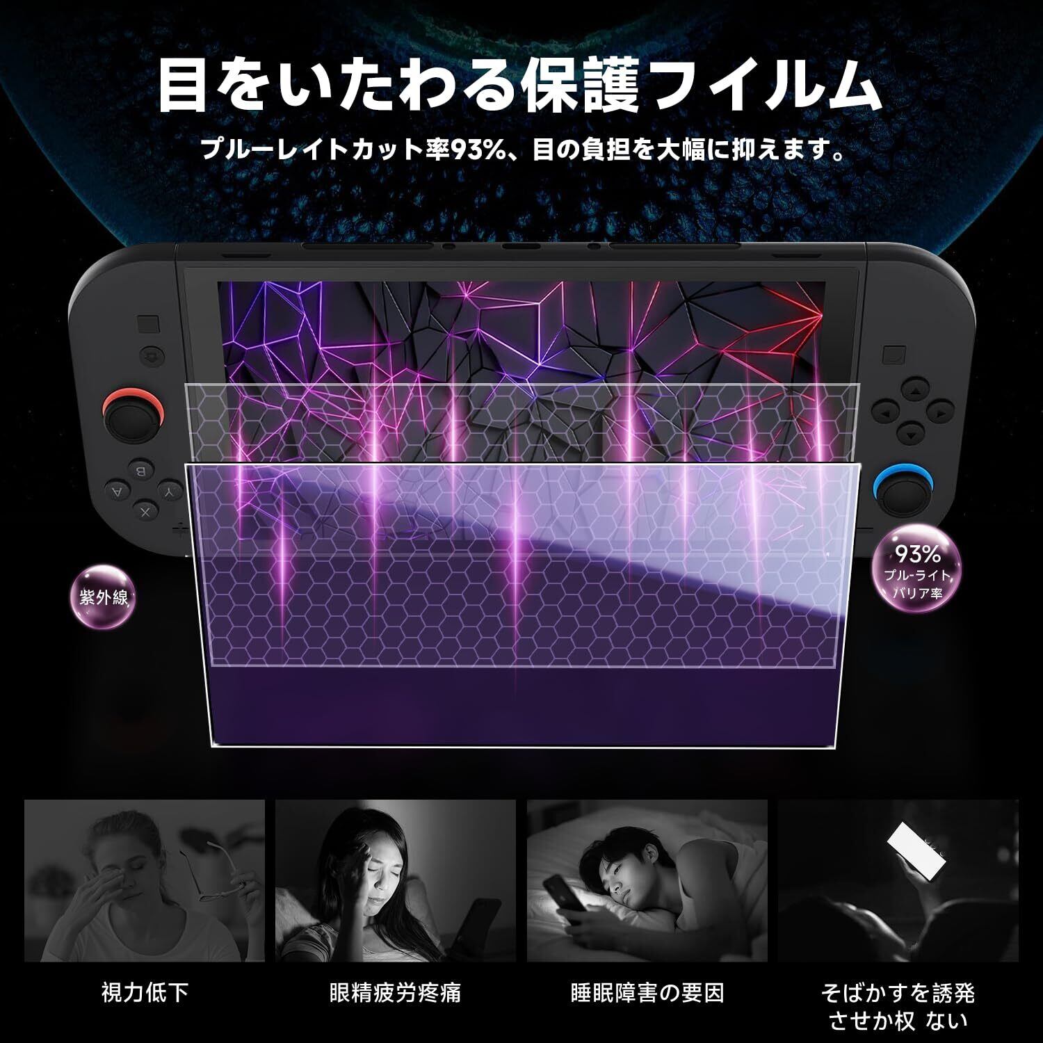 【ブルーライトカット】Nintendo Switch2 強化フィルムのコアにブルーライトカット反射技術を加え、ブルーライトカット率93%に達し、ブルーライトによるダメージを大幅に軽減し、色素沈着を防止、効果的に近視を予防できます、ディスプレイを長時間眺める方に効果を発揮します。(このHD透明ブルーライト防止保護フィルムは、室内では透明に見え、太陽光の下でのみ青く見えます。)