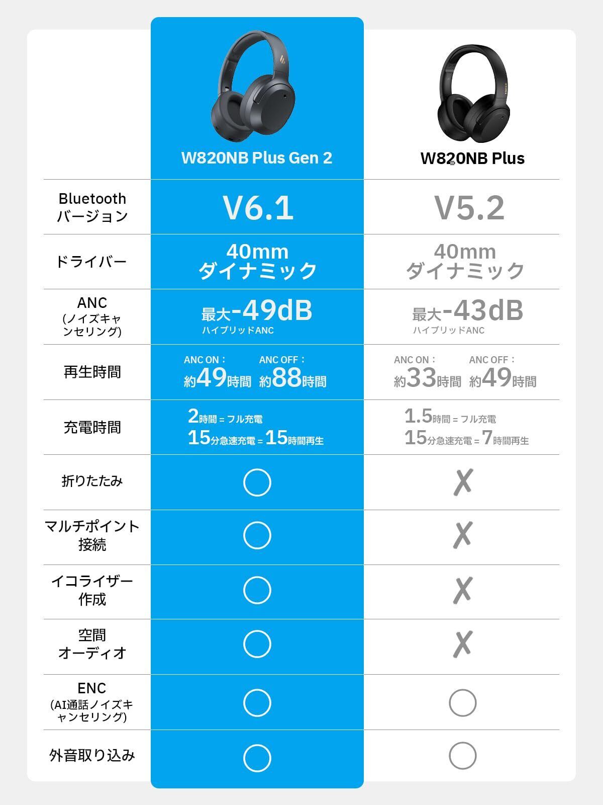 新モデルへのアップグレード:従来型と比較してW820NB Plus Gen2 (W820NB Plus 第2世代)モデルは、外観デザインと機能の両方で大幅に改良しました。折りたたみ式なので、持ち運びや収納が便利になります。急速充電と電池持ちも向上し、Bluetooth6.1、マルチポイント接続、空間オーディオ、カスタマイズ可能なサウンドエフェクト(イコライザー作成)など、様々な機能に対応しています