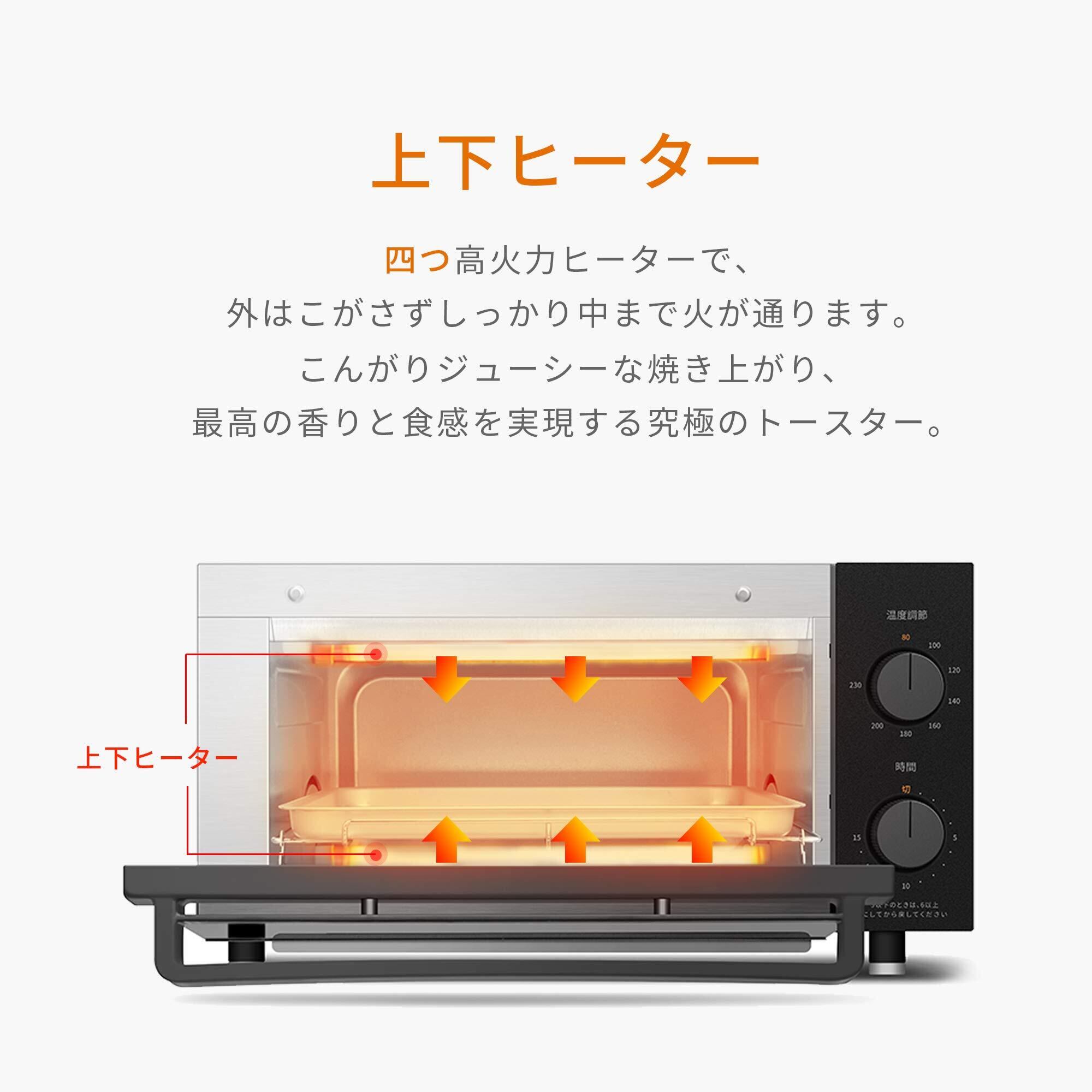 【ムラなく均一に焼ける】上下それぞれ2本のヒーターが搭載され、食材を効率よく加熱し、焼きムラができにくい。最大1200Wの高出力で、こんがりジューシーな焼き上がりを実現。