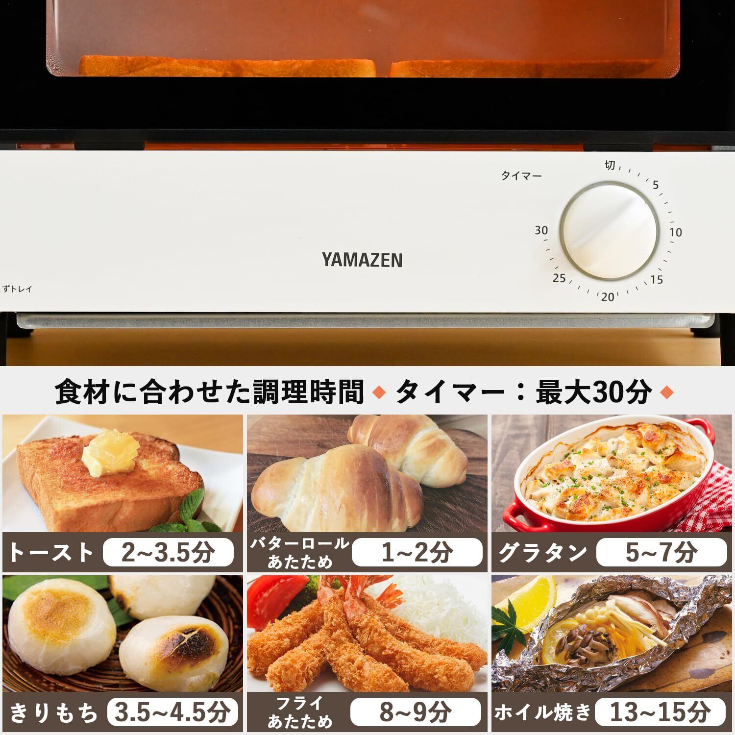 ●最大30分まで設定できるタイマー機能搭載。食パンはもちろん、とろーりチーズのピザにこんがりお餅、グラタンなど食材に合わせてお好みで設定可能。