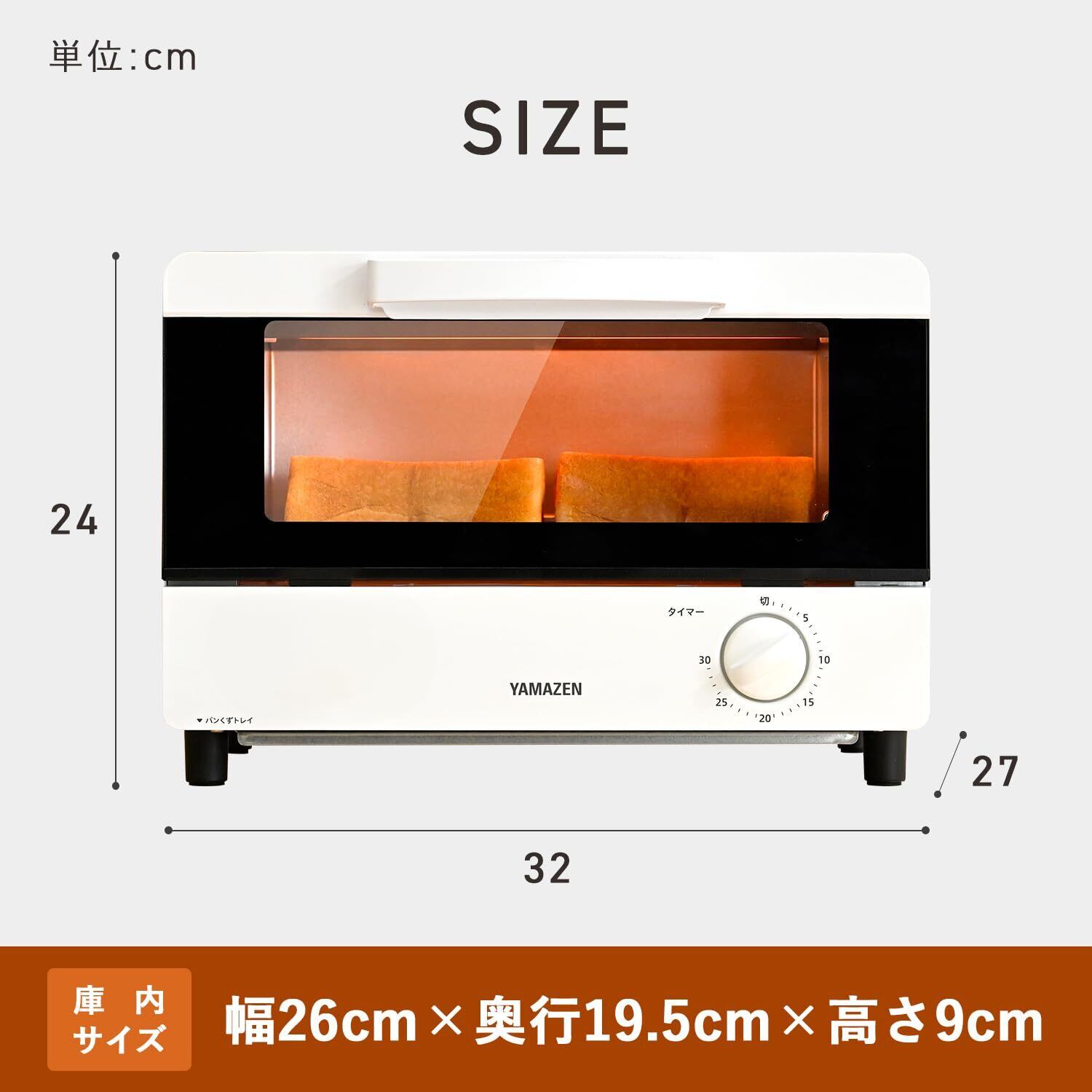 【商品仕様】◇本体サイズ:幅32×奥行27×高さ24cm ◇庫内有効寸法:26×奥行19.5×高さ9cm ◇本体重量:3.4kg ◇電源:AC100V(50/60Hz) ◇消費電力:1000W ◇タイマー:電源スイッチ兼用30分タイマー ◇電源コードの長さ:1.1m ◇期間:お買い上げ日より1年間(の範囲については、取扱説明書をご確認ください。(一般家庭用以外(業務用など)に使用された場合の故障及び損傷などは対象外となります))