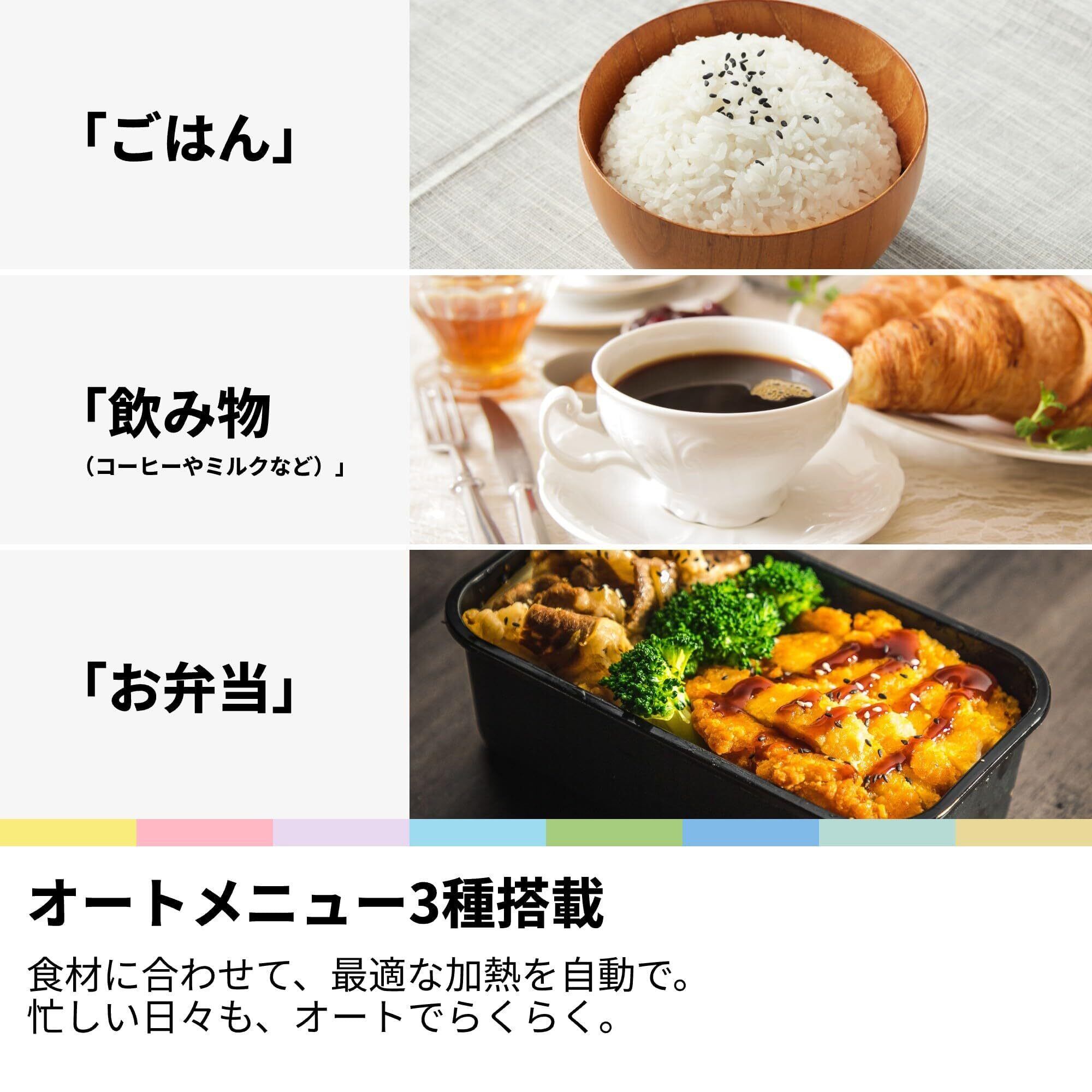 【自動メニュー】「ごはん」や「飲みもの」など、よく使う機能はボタンが別に設けられているため、スムーズに設定できます。手動であたためるといった手間が省けるでしょう!時間と労力を節約!