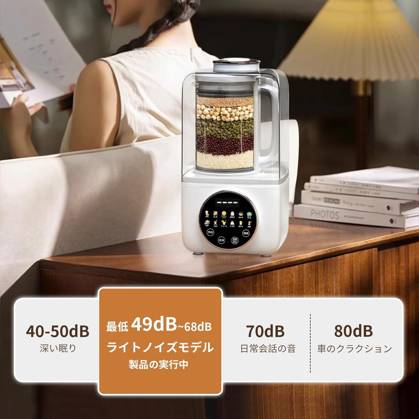 【製品仕様】商品の寸法:16.3奥行き x 18.4幅 x 34.6高さ cm 重量:約2.6kg 加熱出力:600W 攪拌出力:150W 電圧:100V(50/60Hz) 容量:1000ml 材質:杯体,高硼珪酸ガラス.杯蓋,食品グレードPP. 刀頭,ステンレス304. コード長さ:約1.8cm 騒音レベル:53〜68dB(防音カバー付き)14種類のプリセット料理モード 冷飲・熱飲両対応