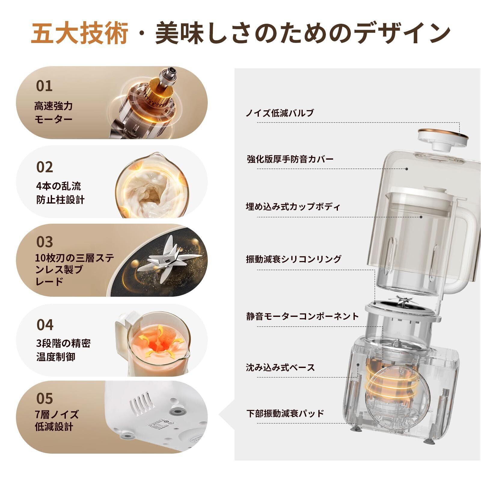 【安全な設計&防音カバー付き】 本製品はPSE認証を取得しており、安全性の高い素材を使用。高硼珪ガラス製の耐熱ブレンダーカップは、の高温にも耐えられる防爆設計で、優れた耐久性と保温・保冷性能を実現。フタを開けたりカップを持ち上げたりすると自動的に停止する安全機能や、過熱・誤操作を防止するスマートセーフティプロテクションシステムも搭載。さらに、により10枚刃の三層ステンレスカッター、強力な破砕力で食材を均一に攪拌し、底に残さず仕上げます。本体は軽量で片手でも扱いやすく、省スペースなコンパクト設計。7層構造の騒音低減システムと柔音設計(53〜68dB)の防音カバーにより、使用中の音も気になりません。