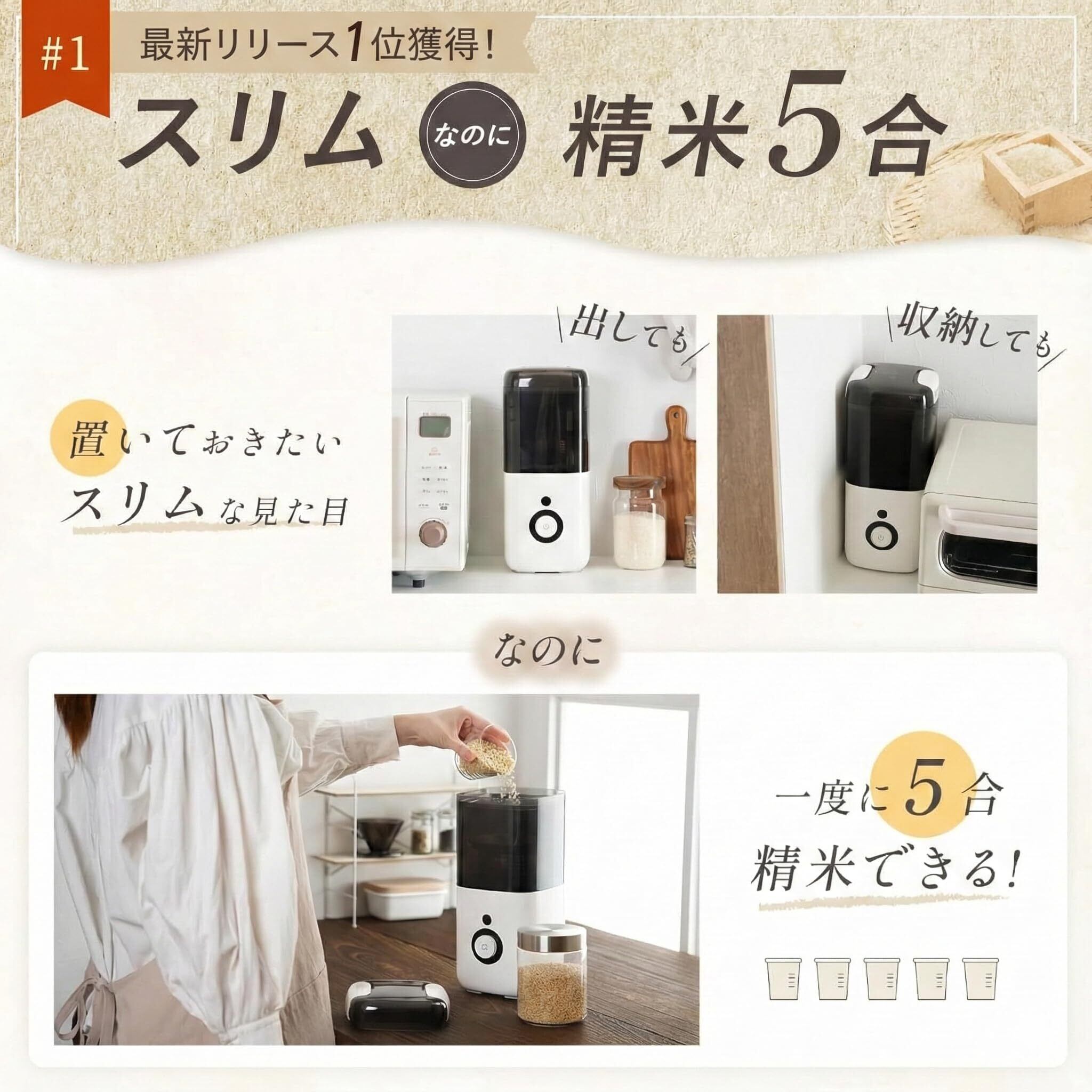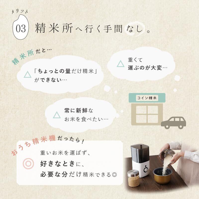 スリムでコンパクトなデザイン: わずか15cmの省スペース設計で、一般的な精米機よりも軽量でスリム。見た目にも収納にもこだわった毎日使いやすいデザインです。