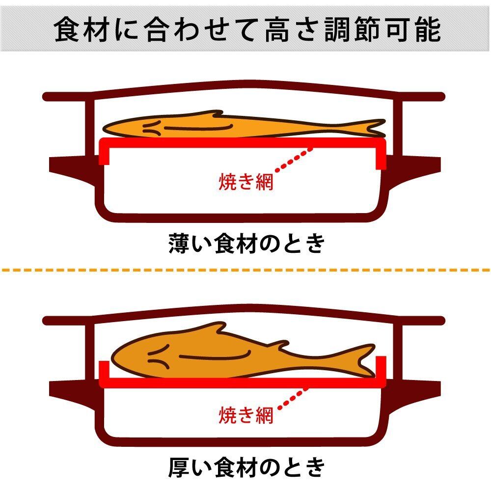 裏返し不要な両面焼きで、焼き網は2段階の高さ調節が可能です。