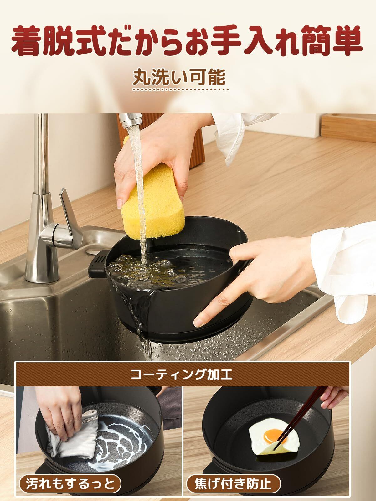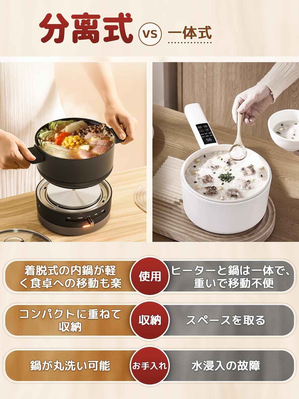 【お手入れカンタン】分離型デザインで、内鍋は取り外せて拭いたり洗ったりしやすく、後片付けの手間を軽減できます。鍋はフッ素加工で焦げ付きにくく、焦げ付きも防げるため、清潔な状態を保てます。 長いハンドルもないので、保管スペースを節約できます。
