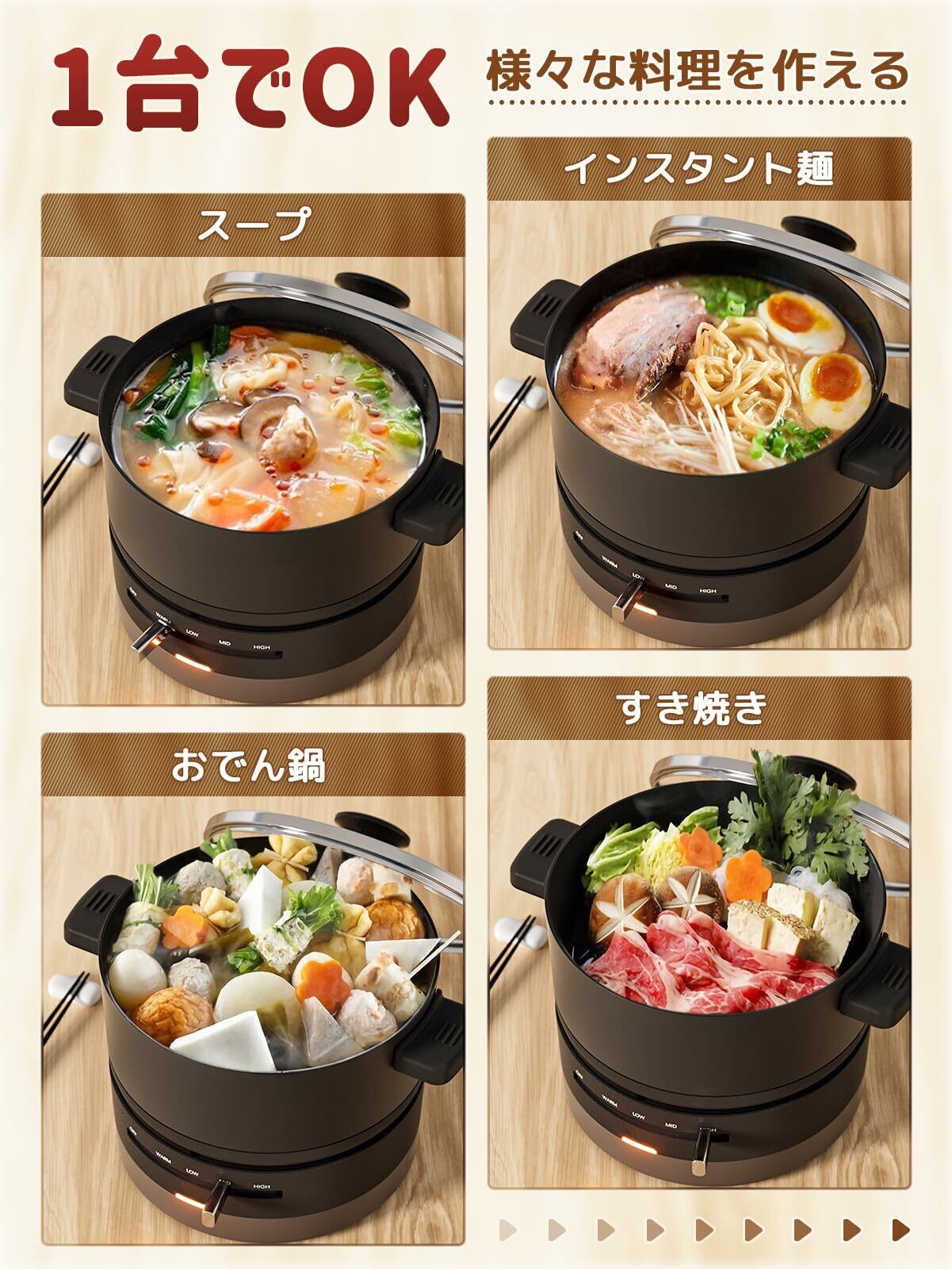 【卓上に置いて使いやすい一人鍋】1.0L容量の深鍋が外せるからそのまま皿として食卓へ。一人暮らしに便利な1〜2人用。小型で低電力なので、アウトドアポットとして使用でき、車中泊、キャンプ、旅行にでも、温かくてヘルシーな食べ物をすることもできます。
