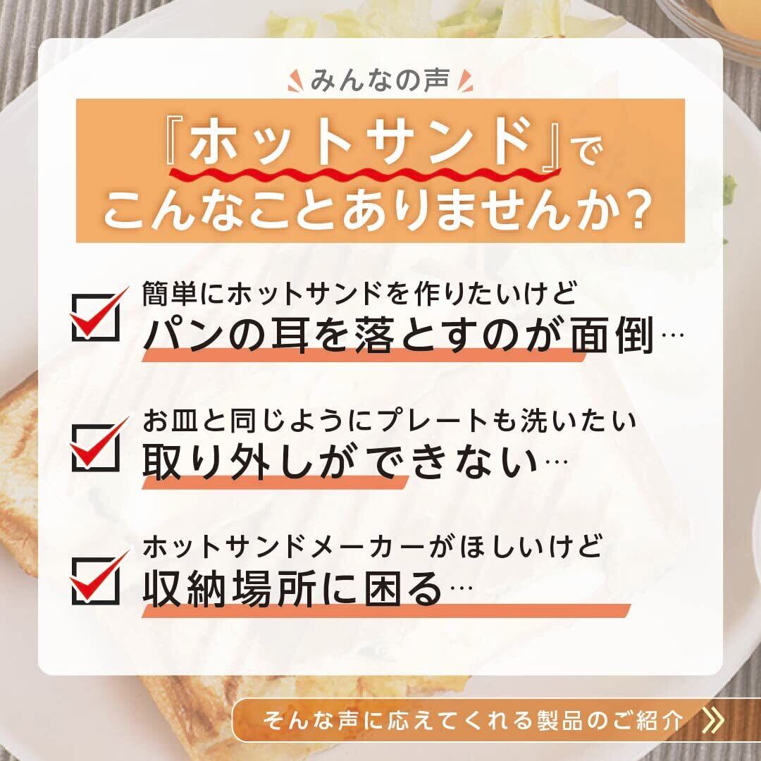 【たったの3分で完成】お好みの食材をパンにのせてフタを閉めるだけ。約3分でサクッと香ばしいホットサンドが焼きあがります!忙しい朝やちょっと小腹がすいた時のおやつや夜食に、手軽に作ることができますホットサンドで、時短・簡単・美味しいを極めましょう!※具を入れすぎたりすると、本体の蓋が閉まりにくい場合があります。無理に蓋を閉じないでください。
