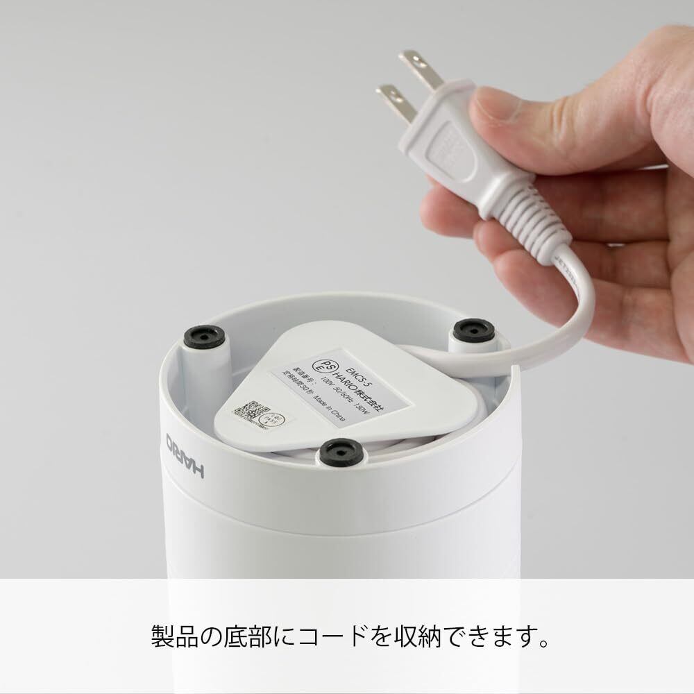 引く時間で粒度の調整ができるプロペラタイプのコーヒーミル。フタをきちんと閉めた状態でないと動作しない安全設計です。コードは製品底部にコンパクトに収納できます。