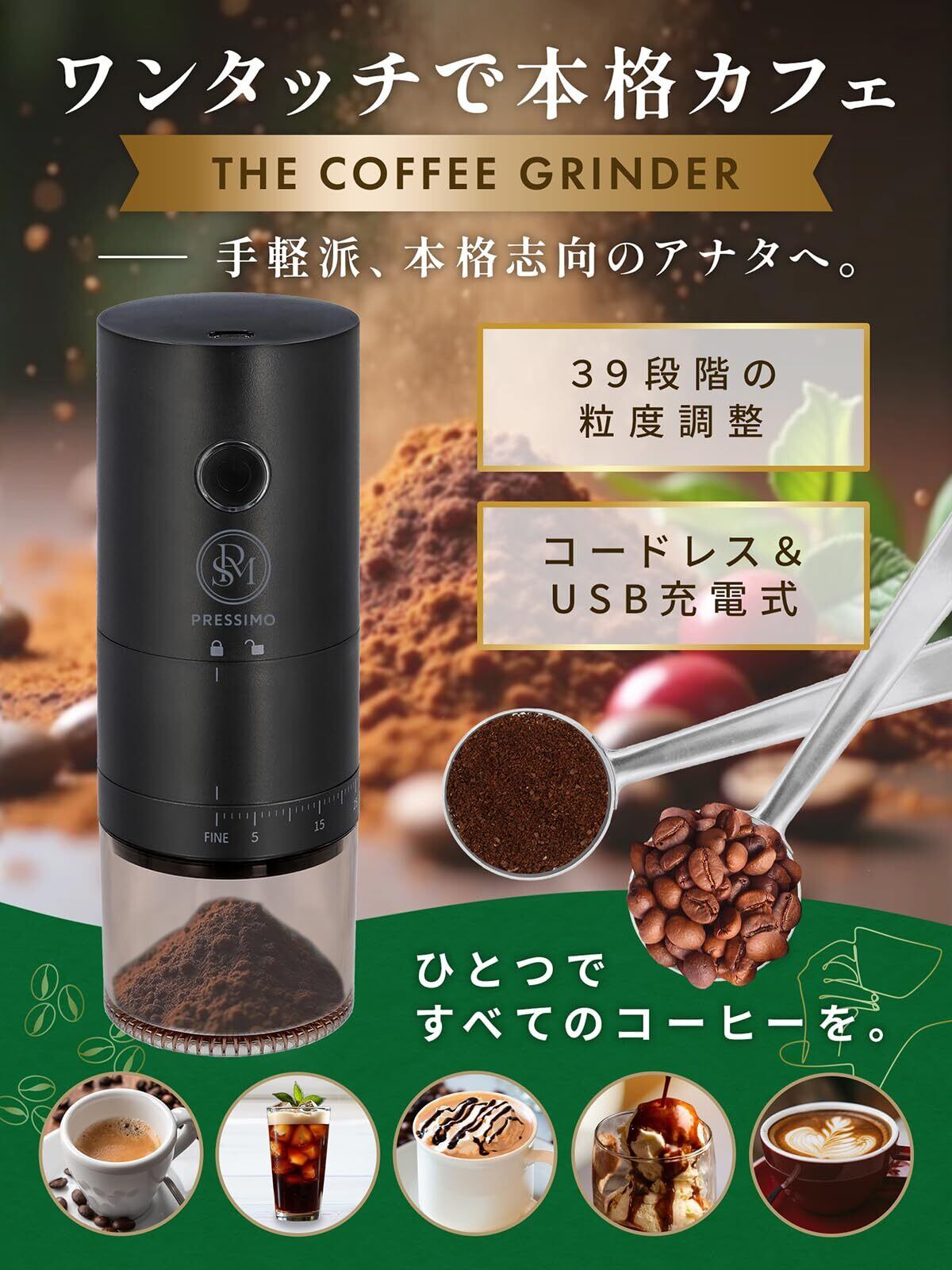 【新春セール】電動コーヒーミル コードレス 39段階調節 クリップスプーン&持ち運びポーチ付属 USB-TypeC 充電式 臼式 コニカル式 大容量バッテリー 水洗い可能 外部ダイヤル
