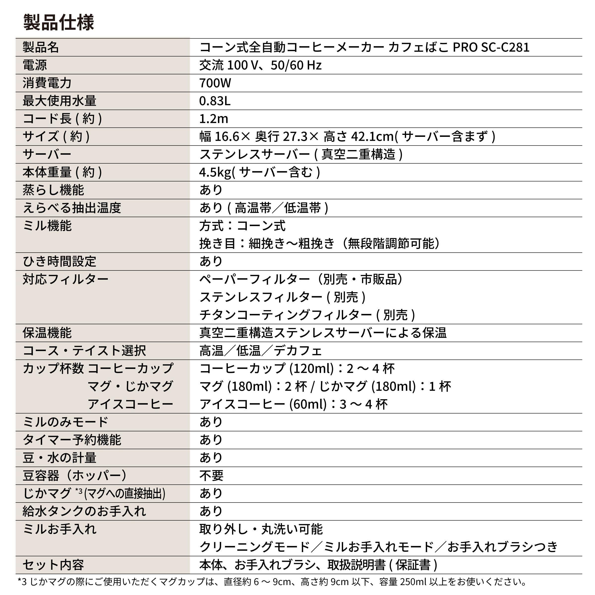 ミル機能:方式:コーン式/挽き目:細挽き~粗挽き(無段階調節可能)