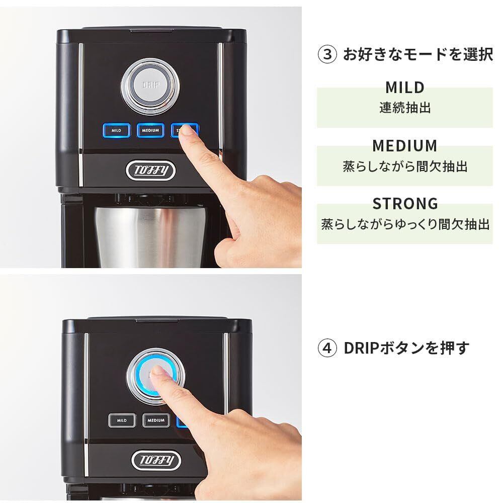 「間欠抽出」でハンドドリップのようにコーヒー粉を蒸らしながら抽出。 マイルド、ミディアム、ストロングの3 段階からの味わいが選べます。 MILD:連続抽出。まろやかであっさりといた味わい MIDEUM:蒸らしながら間欠抽出。優しい苦みとやわらかな酸味のバランスの取れた味わい STRONG:蒸らながらゆっくり間欠抽出。濃厚で、コク深い味わい