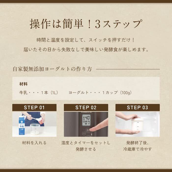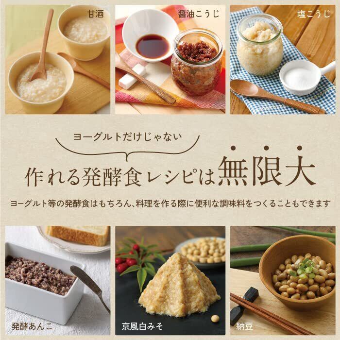 対応発酵食:ヨーグルト、甘酒、塩こうじ、醤油こうじ、京風白みそ、納豆、チーズ、天然酵母 低温調理:温泉卵、ローストビーフ、チャーシュー、コンフィ、サラダチキン