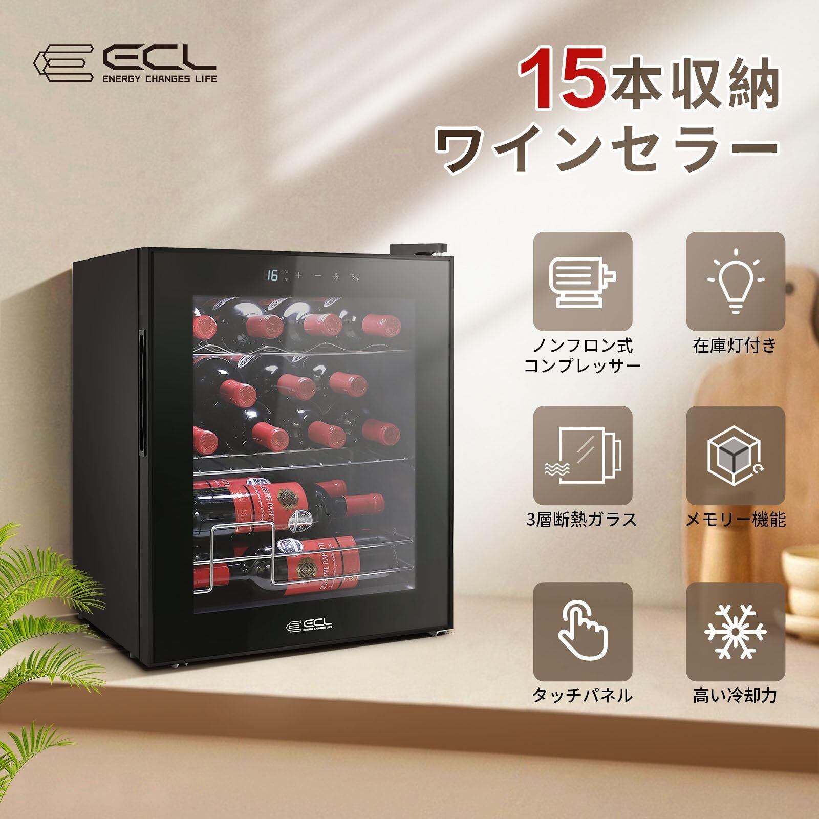 ECL ワインセラー コンプレッサー式 小型 15本収納 シャンパン冷蔵庫 ワインクーラー 5℃-18℃温度設定 日本酒 ワイン保存 静音 振動抑制 省エネ 三層ガラス LEDライト メモリ機能搭載 タッチパネル 家庭用 業務用 PSE認証済み