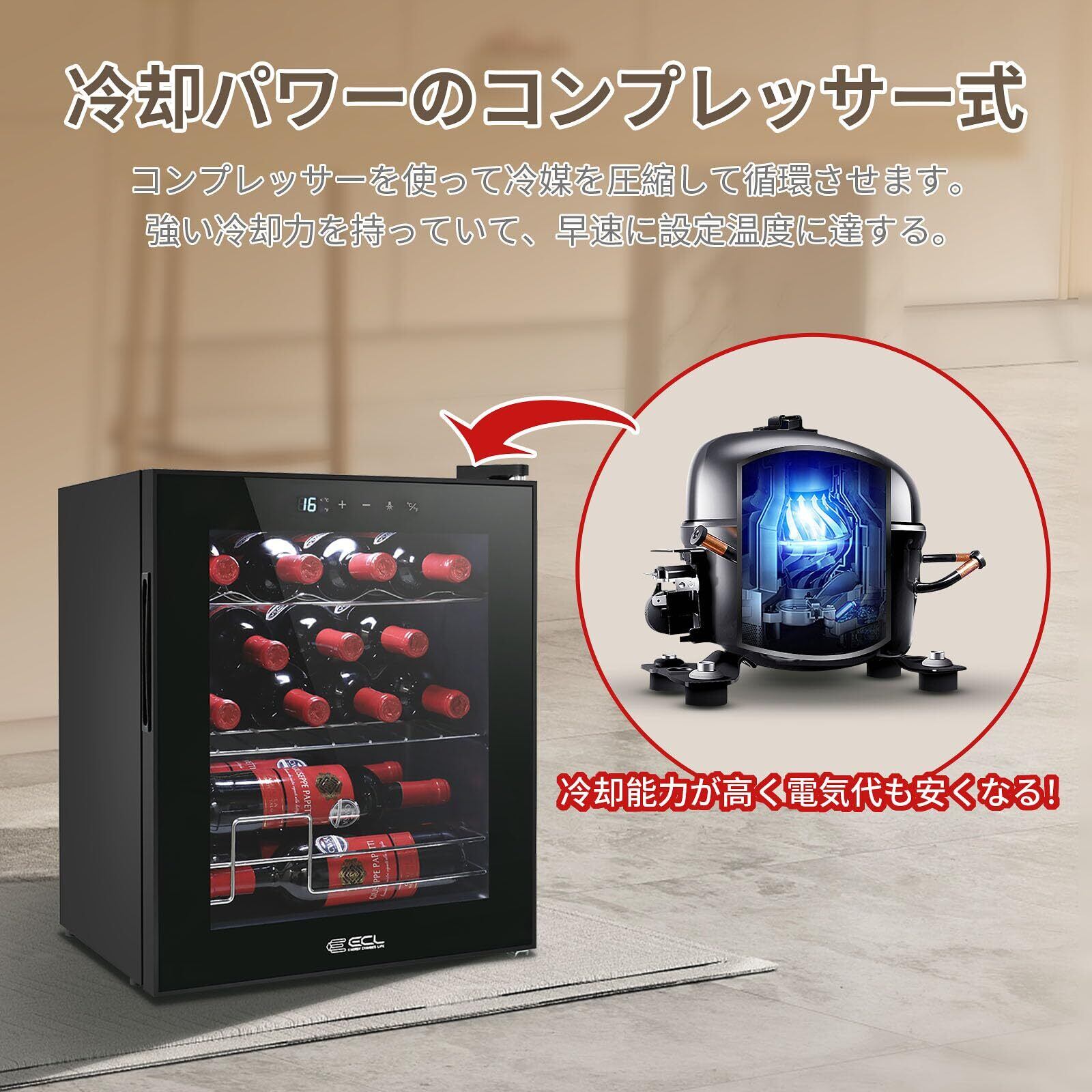 【数量限定】ECL ワインセラー コンプレッサー式 小型 15本収納 シャンパン冷蔵庫 ワインクーラー 5℃-18℃温度設定 日本酒 ワイン保存 静音 振動抑制 省エネ 三層ガラス LEDライト メモリ機能搭載 タッチパネル 家庭用 業務用 PSE認証済み