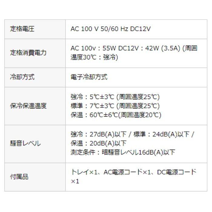 保冷保温温度 強冷 : 5℃±3℃ (周囲温度25℃) 標準 : 7℃±3℃ (周囲温度25℃) 保温 : 60℃±6℃(周囲温度20℃)
