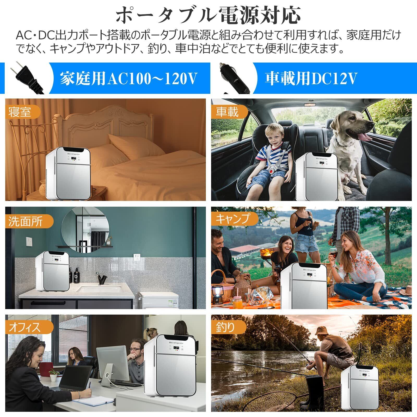 【家庭・車載両用】AC 110V DC 12V 入力が設置されています、本体への給電はAC電源とシガーソケット電源に対応しています。AC・DC出力ポート搭載のポータブル電源と組み合わせて利用すれば、家庭用だけでなく、キャンプやアウトドア、釣り、車中泊などでとても便利に使えます。家庭でも車載でも通電できるポータブル冷温庫です。