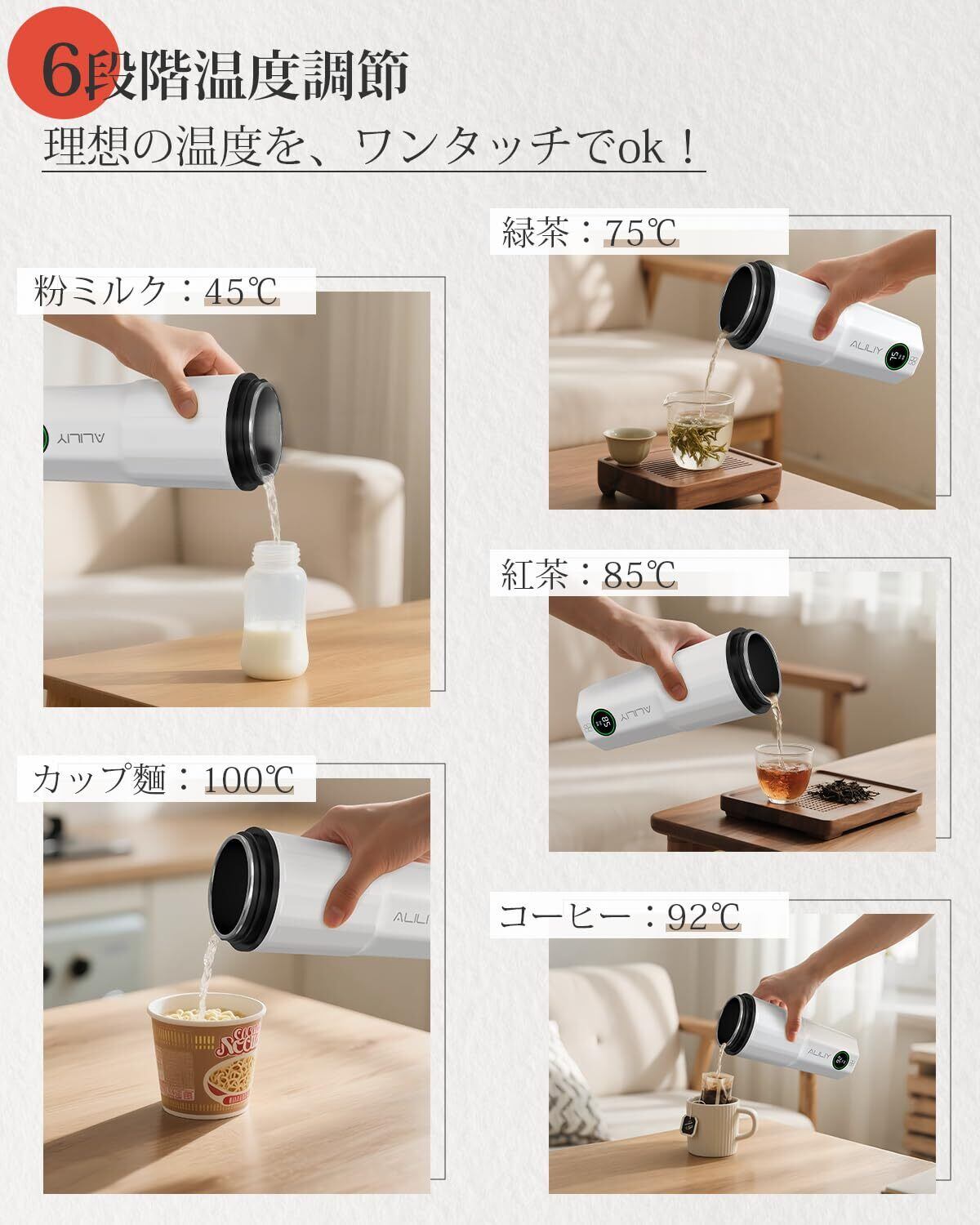 【3.0時代へ進化!小型電気ケトルで自由な水生活を】個人向け・専用のALILIY ポータブル電気ケトル。日常生活に適切な水分補給は体の調子を整え、集中力を高め、健康的な生活を支えてくれます。1.0時代の家庭用電気ケトルは自宅のみで使用、持ち運びに不便。また2.0時代のワンタッチ式小型ケトルは小型で便利ですが、水を100℃だけ沸騰させて、温度調節ができません。今度3.0時代スマート携帯電気ケトルは利用し、個人向けの水生活を楽しもう!