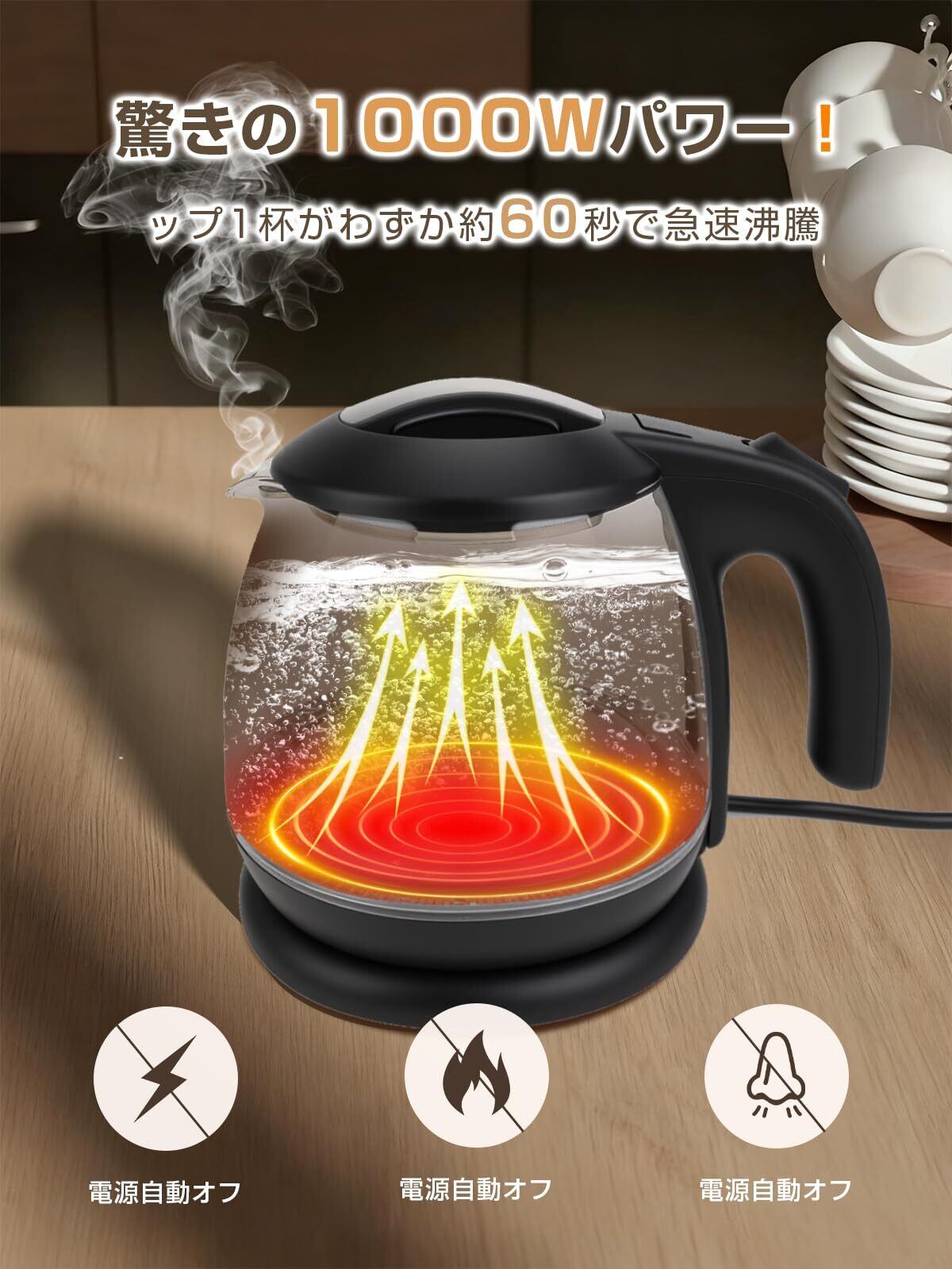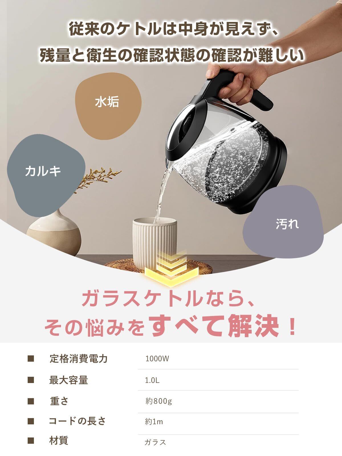 【数量限定】電気ケトル ガラス ケトル 大容量1.0L ケトル 湯沸かしケトル【2025冬革新版 1000W急速沸かし】湯沸かしケトル LEDライト付 電気ポット お湯・コーヒー・お茶・粉ミルク 湯沸かしポット 小型 おしゃれ お手入れ簡単 沸騰自動OFF・空焚き防止機能 一人暮らし 二人暮らし PSE認証済み (ブラック)