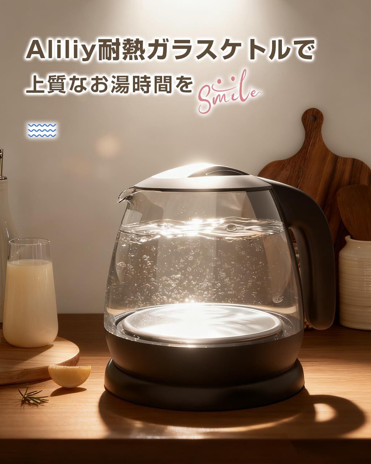【お湯の状態が一目でわかる・清潔面も安心!】Aliliyの透明ガラス電気ケトルは、その美しいデザインと透明なガラスが魅力的。お湯の沸き具合や量がひと目でわかり、沸騰していく様子を見るのも楽しい!ガラス製なので、匂いや不快な成分が移る心配もなく、いつでも安心して使用できます。さらに、広口設計でお湯を注ぎやすく、内部が見えるので水垢や汚れもすぐに確認でき、掃除も簡単。毎日のコーヒー作りが、もっと楽しく、快適になりました