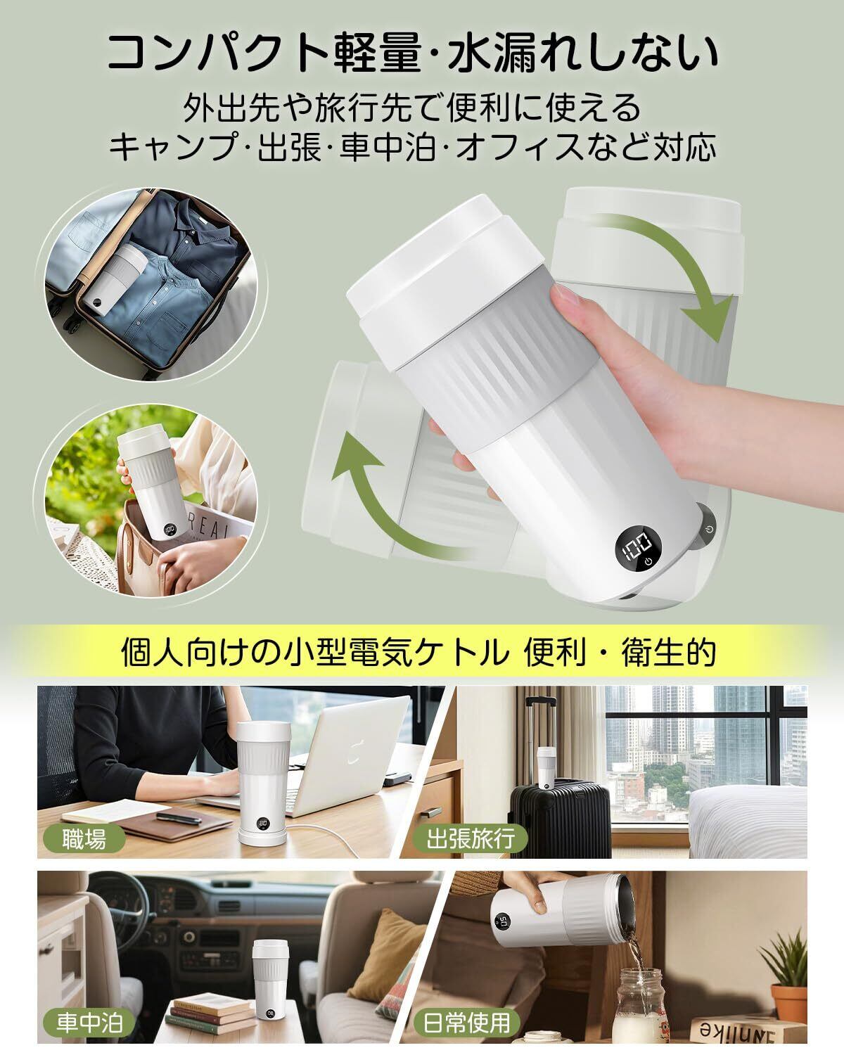 【在庫セール】電気ケトル ポータブル トラベルケトル 小型 6段階温度調節 12時間保温 分離式 コード収納可 300ML 100V 250W 低消費電力 持ち運びケトル 湯沸かし 一人暮らし 電気ポット 急速沸かし 空焚き防止 漏れない ステンレス 二重構造 お湯・コーヒー・お茶・粉ミルク 水筒 電気温水カップ 旅行 車中泊 オフィス 出張 ギフト 日本語説明書付き PSE認証済み (ホワイト)