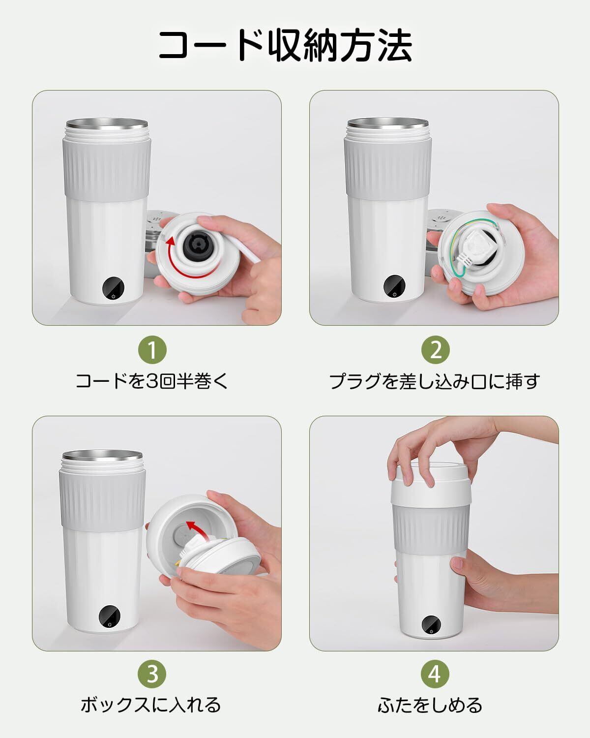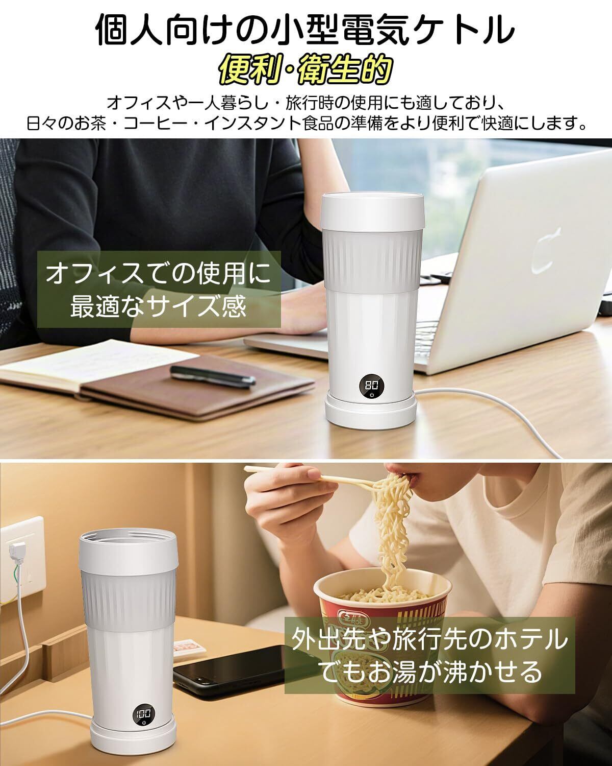 【理想の生活を追求!使い易い分離式&コード収納可】Aliliy携帯用300mlのポータブル電気ケトルは小さいサイズで職場のデスク上に置いても場所を取らないです。より使いやすい分離式設計、電源ベースから外せば本体はコードレスなので、注ぎの際に抜き差し不要、コードを気にせず手軽に使えます。コードと電源プラグを蓋にまとめられてすっきりと収納し、見た目を良くするだけでなく、収納時にかさばらないです。小型軽量でバッグやスーツケースに入れて持ち運びやすく、コンセントやポータブル電源に繋けば、いつでもお湯が沸かせます。小型電気ポットは衛生面が気になる人や、出張先や旅行先や外出先でも温かい飲み物を楽しみたい方にぴったりです。