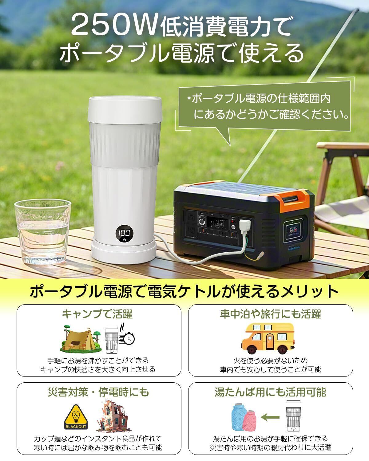 【250W低消費電力でポータブル電源に接続して使える】ポータブルケトルはわずか250Wの低消費電力で、ポータブル電源に接続してお湯が沸かせます。電気ケトルとポータブル電源の組み合わせは、キャンプやバーベキューなどのアウトドアレジャー、車中泊に最適であり、災害時や停電時にも役立ちます。火おこしの手間がないほか、素早くお湯を沸かせるため、時間と労力を節約できます。お湯を沸かす電気ポットとポータブル電源がセットであれば、こうした活用シーンの範囲が格段に広がり、自由度が高まります。※本製品はバッテリー内蔵製品ではありません。充電式ではありません。