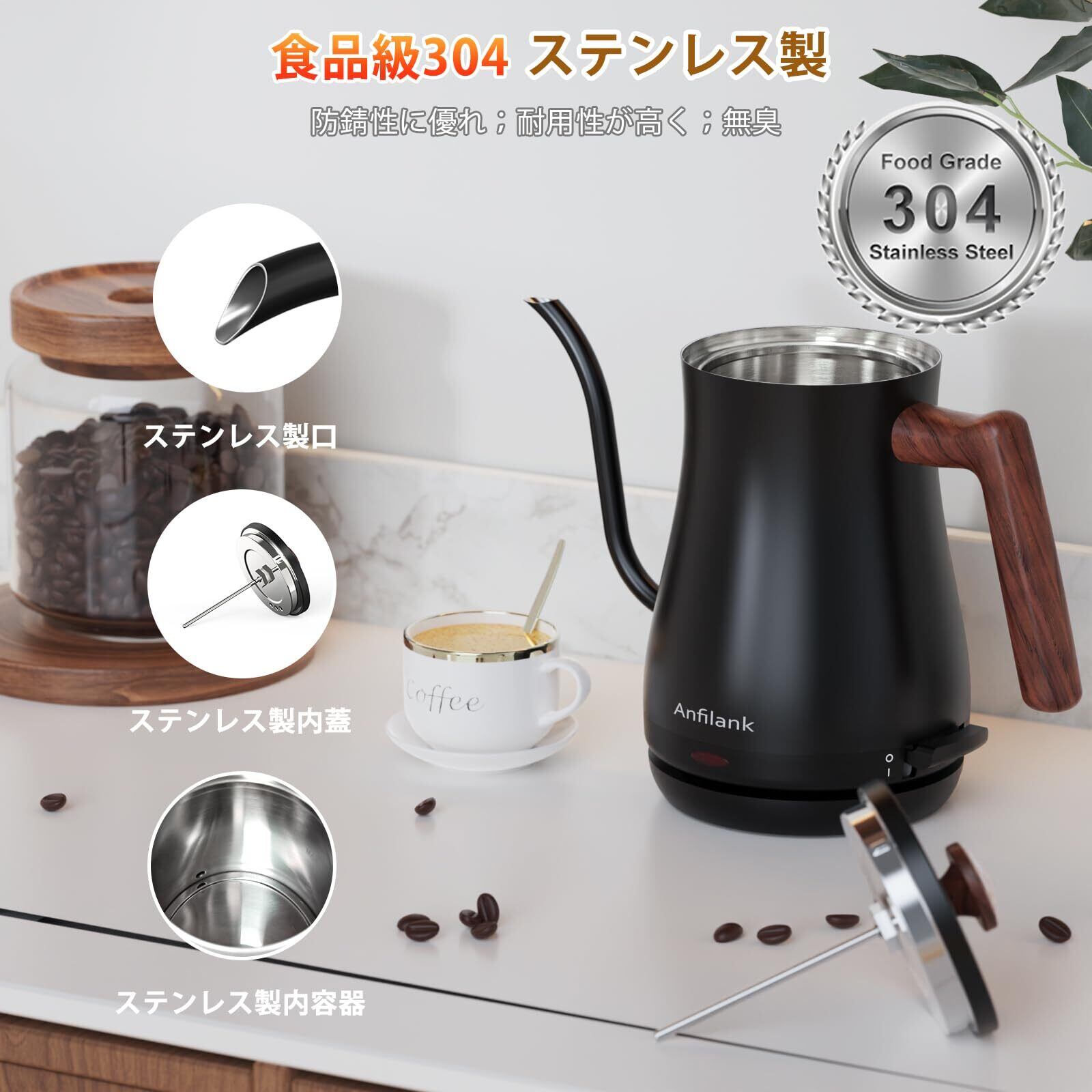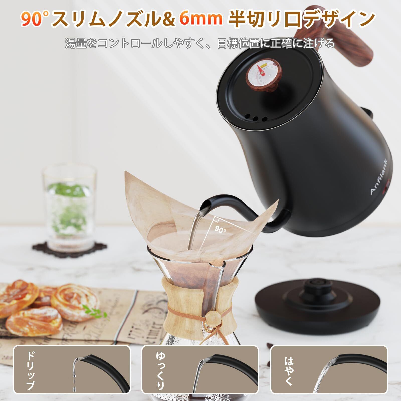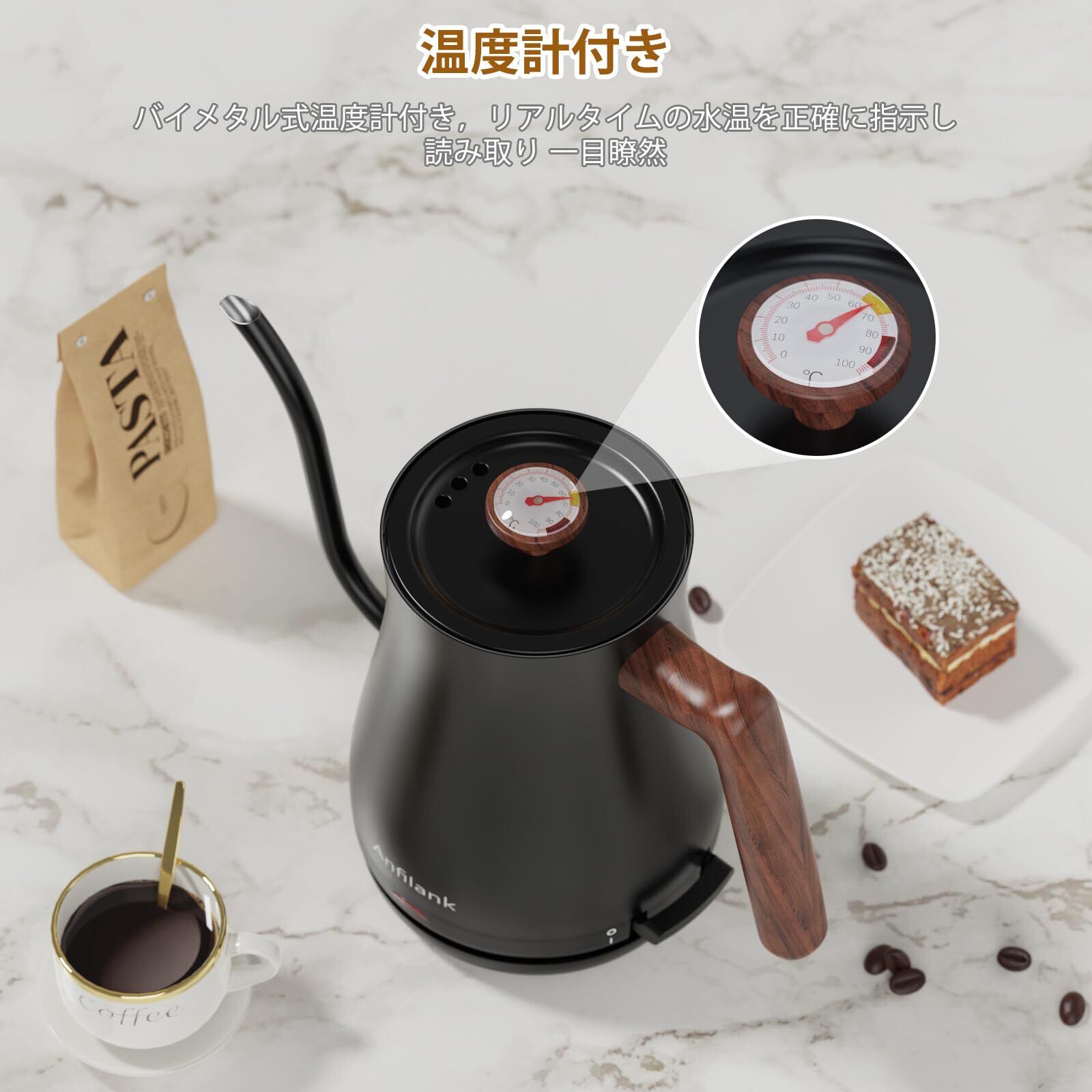 電気ケトル 0.8L コーヒー 温度計付き ドリップケトル ANFILANK 電気ポット 1200W ケトル コーヒーポット ドリップ ステンレス製(急速沸騰/空焚き防止/自動電源オフ) PSE認証済み 湯沸かし 一人暮らし お手入れ簡単 細口 おしゃれ コンパクト プレゼント 木目調(ブラック )