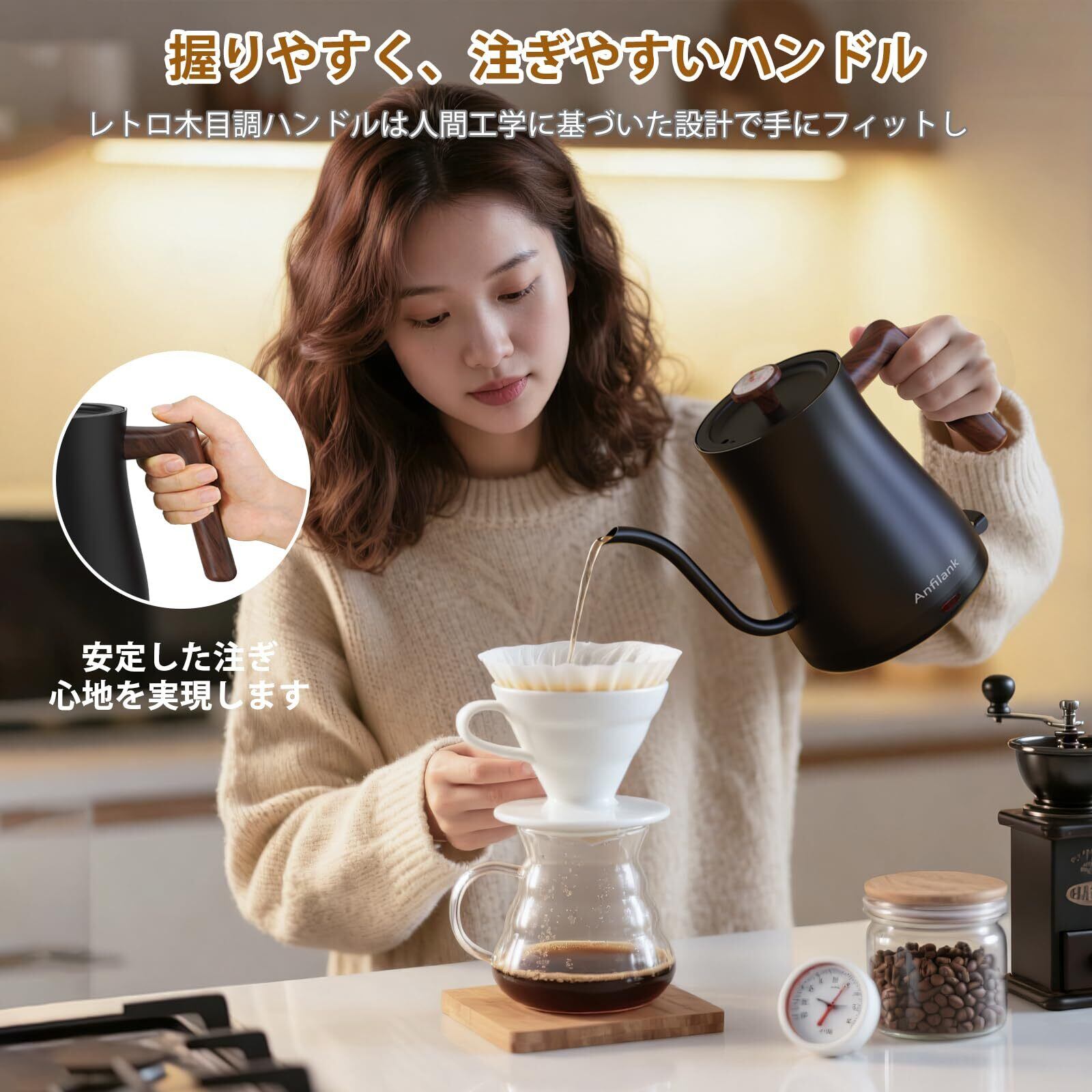 【スリムノズル、握りやすいハンドル! 】 ANFILANKドリップケトルの注ぎ口はスリム形状を採用し。細口ノズルは、出水口がより細いだけでなく、首の部分の幅も均一に保たれているため、ドリップコーヒーを入れる際に水量のコントロールがしやすくなり、目標の位置に正確にに注げます。初心者でも、自分好みの美味しいコーヒーを手軽に仕上げられます。長時間持っても疲れにくいハンドルは人間工学に基づいた設計で、手にフィットし、安定した注ぎ心地を実現します。木目調の質感が加わり、手に馴染む握持感が抜群なだけでなく、マット調の洗練されたキッチンに、温かみのある高級感をプラスします。断熱性に優れたハンドルで、お湯が沸いていても熱くならず、安全かつ快適に操作できます。