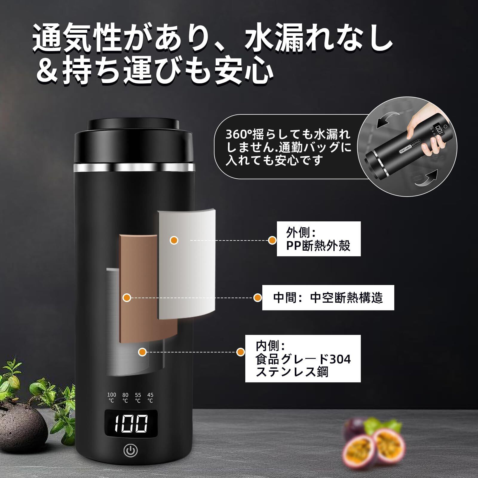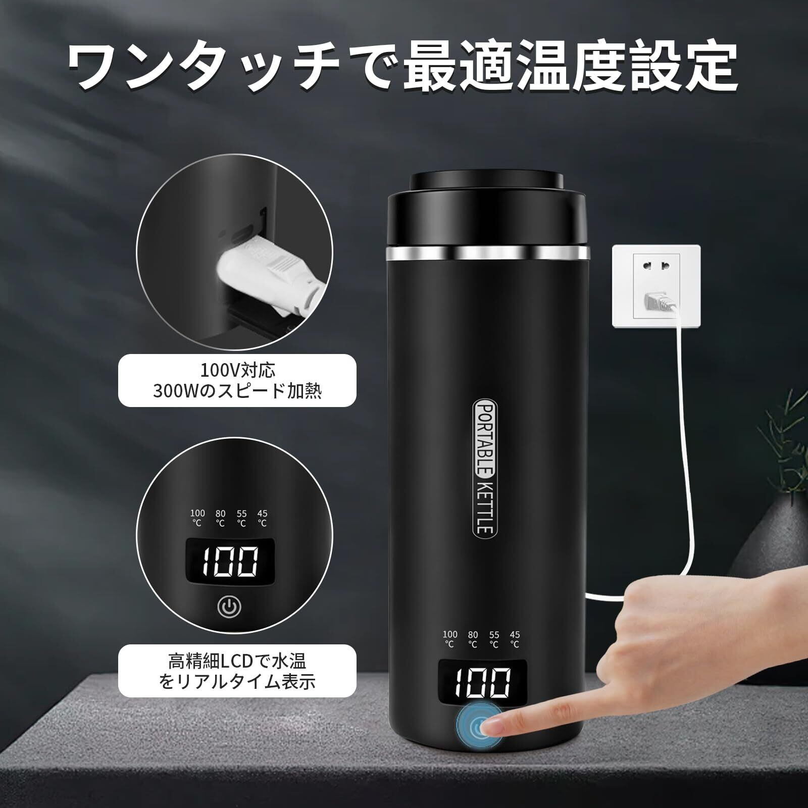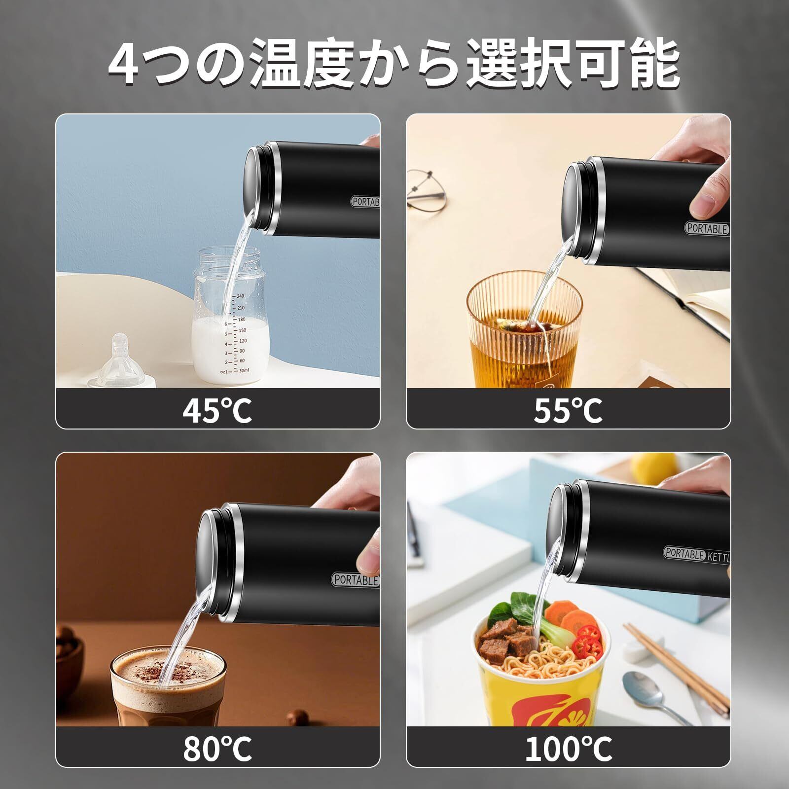 4つの温度設定-タッチ操作で4つの温度を選択可能。45℃でミルクを淹れ、55℃で緑茶を淹れ、80℃でコーヒーを淹れ、100℃で沸騰したお湯を準備できます。多様な温度から自由に選択し、お好みの水温をカスタマイズできます。コンセントに接続するだけで簡単に沸かせます。携帯用旅行用電気ケトルとして、旅行中でも信頼して使用でき、いつでも「お湯の生活」を楽しめます。