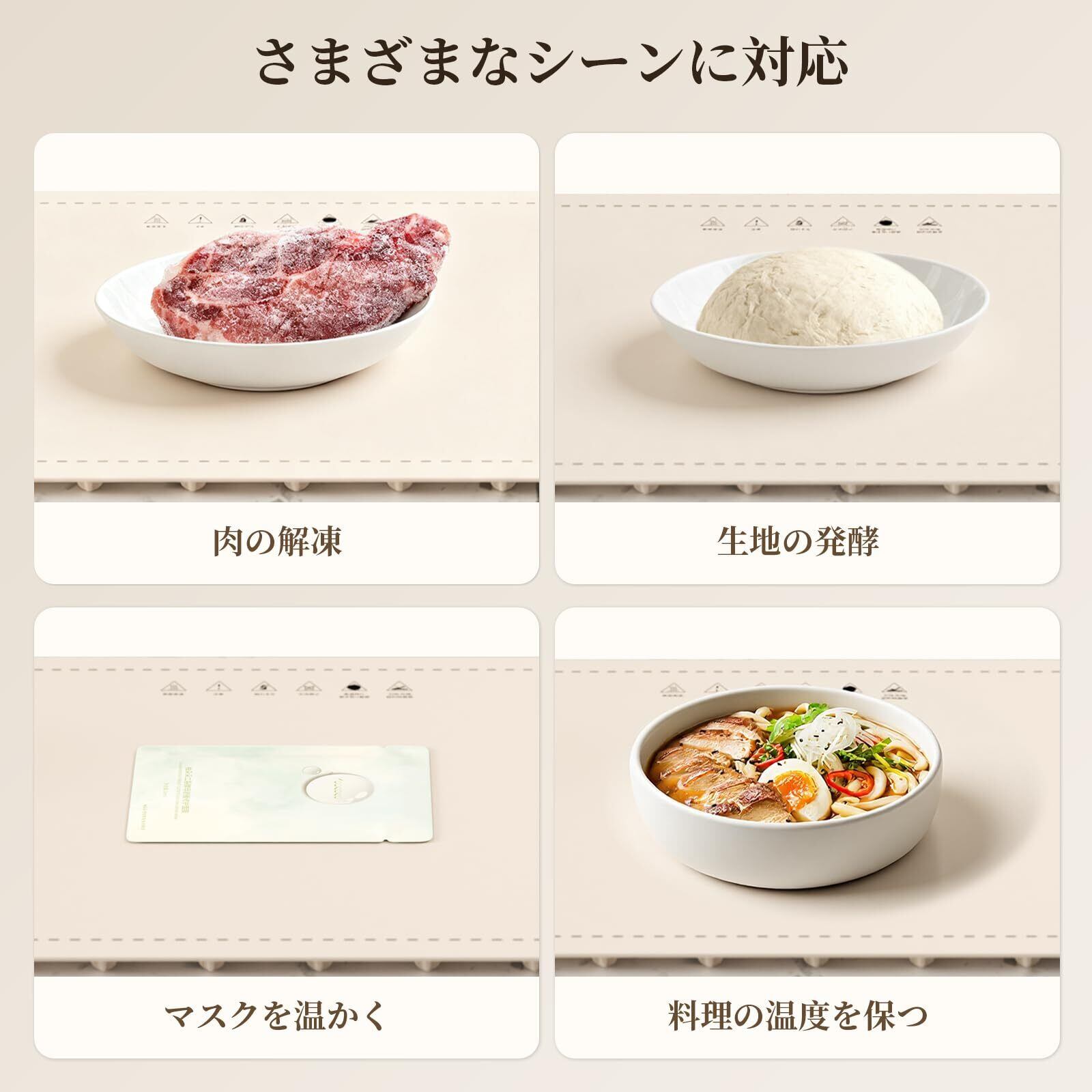 3段階温度調節:温度は用途に合わせて、60℃・80℃・100℃の3段階で調節が可能です。保温や解凍のほか、生地の発酵にも活用できると謳われておりパン作りにもおすすめです。陶器・ガラス・ステンレスなど、さまざまな素材の容器に対応します。