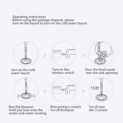 冷水をオンにします蛇口をひねり、コードレススイッチを入れ、生ゴミをシンクに流し、モーターと水の流れる音だけが聞こえるまでプロセッサーを運転し、粉砕終了後プロセッサーの電源を切り、15秒後に水を止めます。