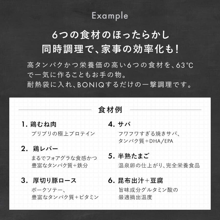 【低温調理のメリットとは・・・】BONIQを使えばお肉の『タンパク質が固まらない温度帯』で調理出来るので、自宅で誰でも簡単にレストランクオリティのお肉が調理出来ます。たった3ステップで安価な赤身のブロック肉やパサつきがちな鳥むね肉ですら、あなたの想像する【理想の肉】へと調理可能な新感覚の画期的調理器具。