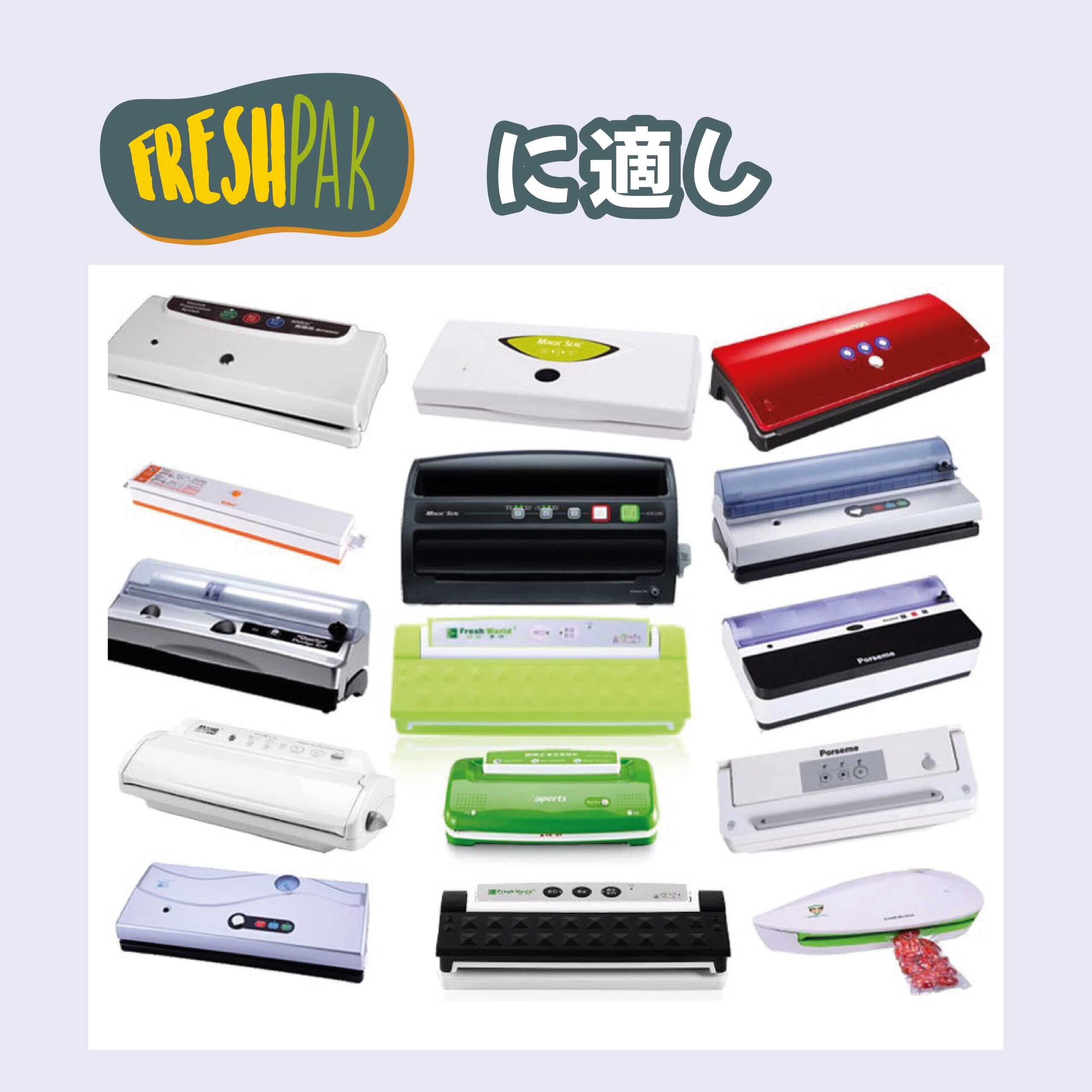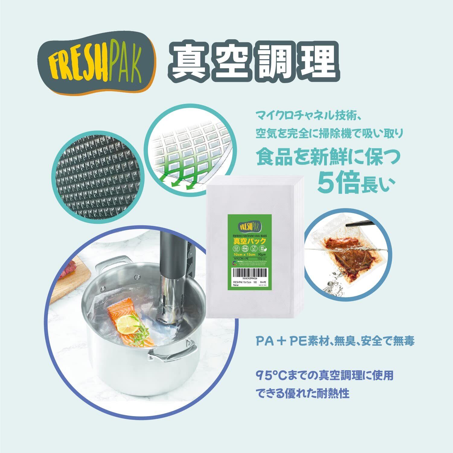 多用途 ▶ 真空吸引により、パックを密封することで、食品の酸化・変質することを抑えます。細菌の繁殖を防ぎことにより、食材の鮮度を延長することができます。 FRESHPAKの真空バッグは耐高温・耐低温により、包装した食材を冷蔵庫に入れて冷凍・冷蔵したり、電子レンジに入れて加熱したり、低温真空調理に使用したり、様々な用途がございます。また沸騰したお湯で調理することもできます。また、レストラン、レストラン、ホテルの厨房、肉屋、寿司屋、魚屋、冷凍食品メーカー、日本と西洋の菓子店でも使用できます。注:電子レンジで加熱に使用する場合は、加熱中の熱放散のために真空バッグに小さな口を開いてください。