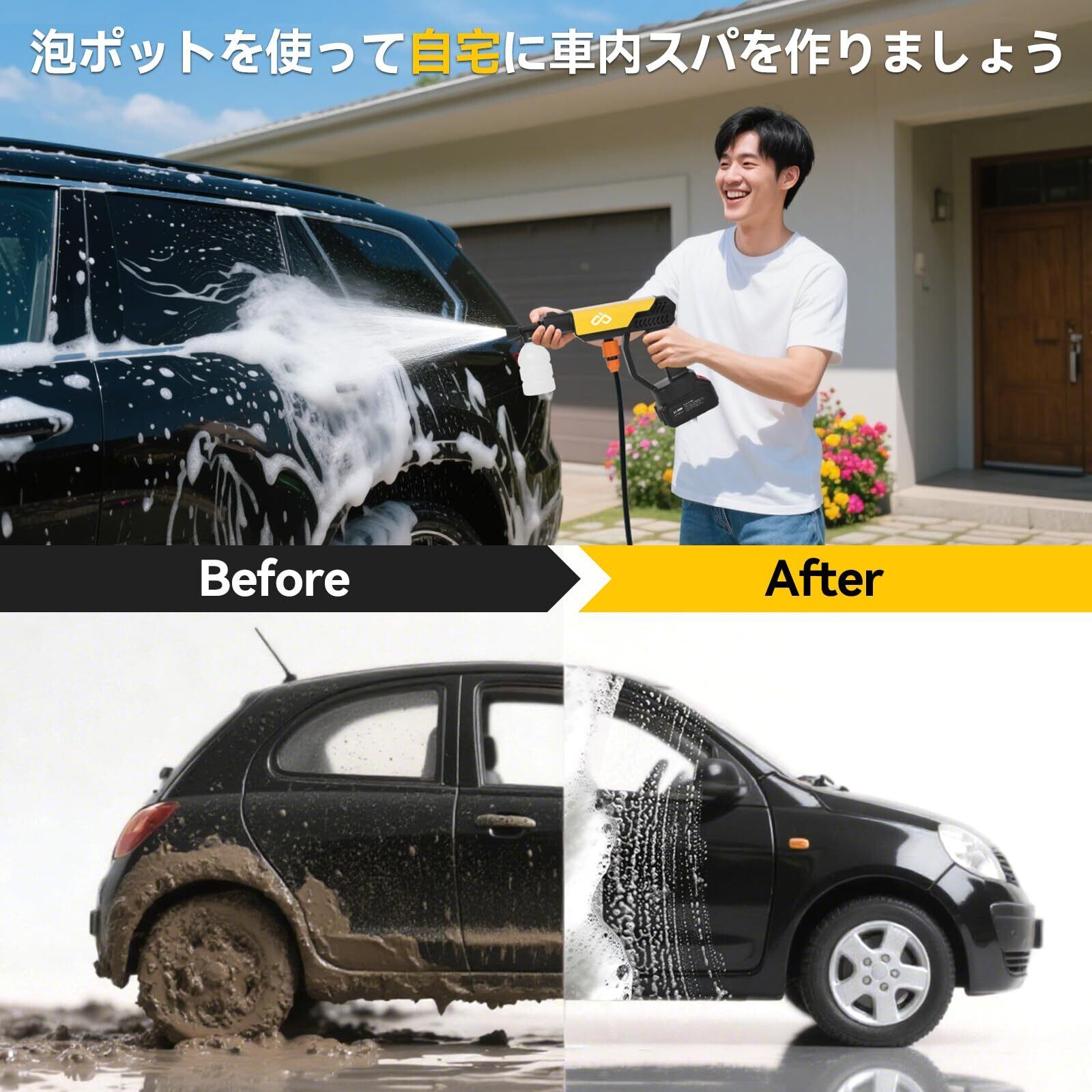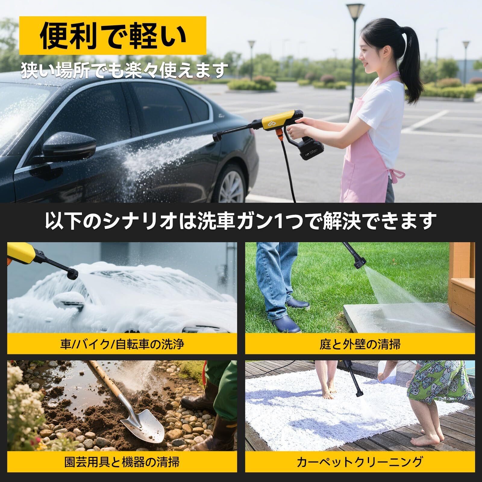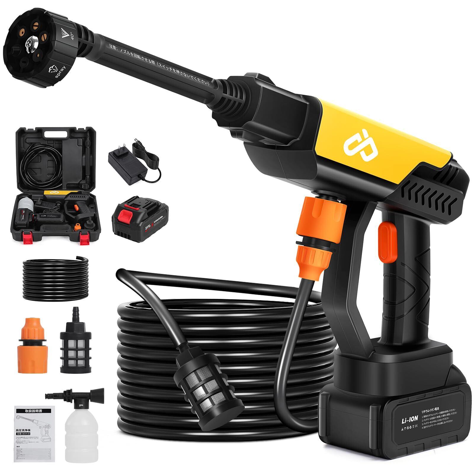 高圧洗浄機【2025新モデル・洗車店監修】コードレス 充電式 / 大容量バッテリー2個付き 合計24000mAh マキタ互換 噴射距離10M 軽量小型 自吸式 多機能6in1ノズル 収納ケース付き 5mホース 洗車 家庭用 庭 ベランダ 網戸外壁園芸用品 YIBEST-yellow
