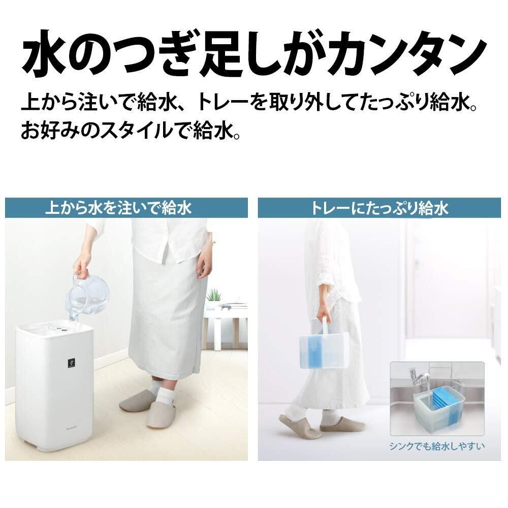 上から注ぐ、トレーを取り外して注ぐ。使う方や利用シーンに合わせて、2つのスタイルで給水が行えます。シャープならではのプラズマクラスターイオンで、お部屋の空気をきれいに。分解してお手入れしやすい構造のため、内部まで清潔さを保てます。長時間運転でも安心のエコモードや快適温度に制御できるWセンサーなど、うれしい機能を搭載しています。
