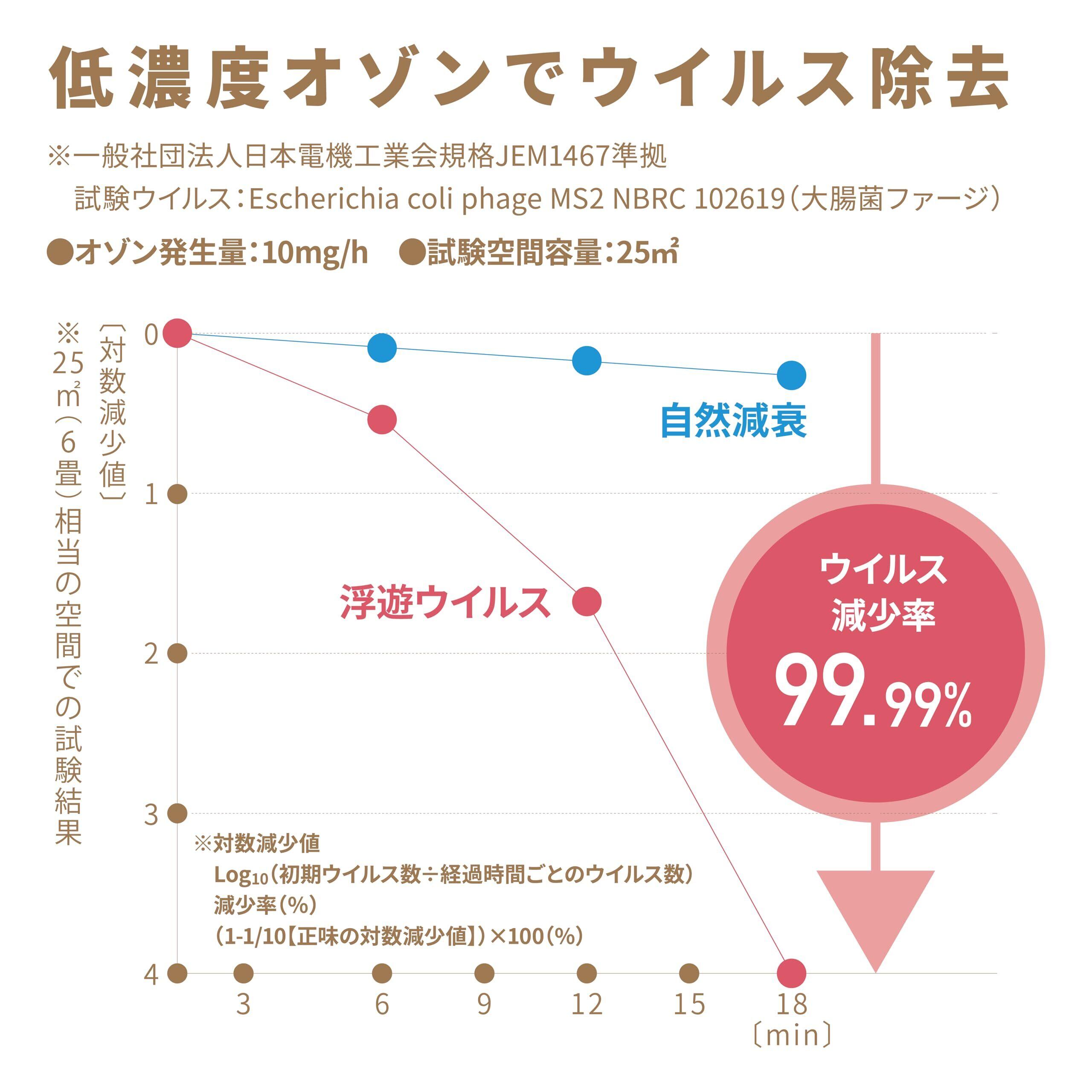 オゾン発生量:1/2/3/4mg/h(4段階切替) 、推奨適用広さ:2~16帖(3~26㎡) 、使用温度条件:0~40℃(結露のないこと)