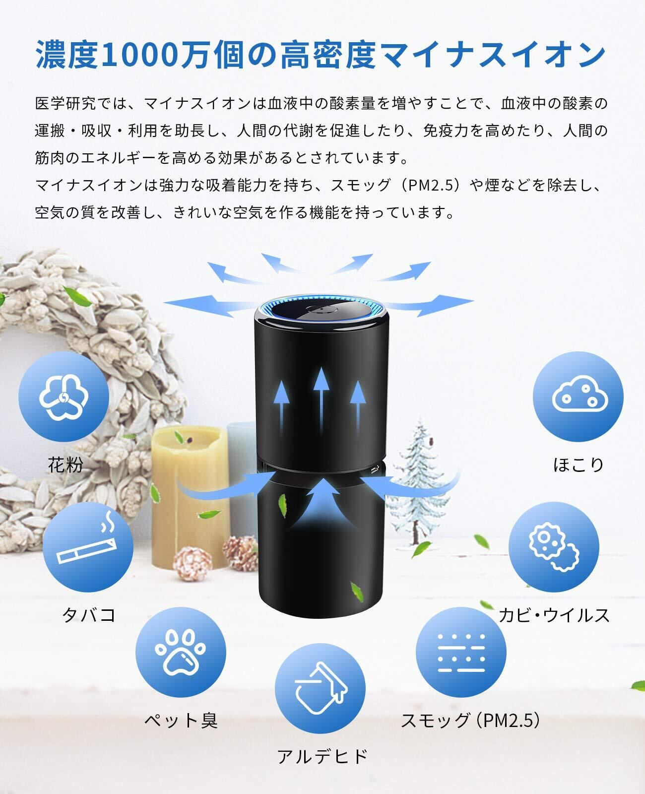 【除塵と消臭を一つにまとめ】マイナスイオンは強力な吸着能力を持ち、マイナスイオンを放出して部屋などに付着したニオイ、スモッグ(PM2.5)や煙などを除去し、ホコリや花粉をしっかり捕集し、カビや雑菌の繁殖も抑制できて、空気の質を改善する機能を持っています。高い空気清浄性能と除臭性能を発揮します、使えば非常に快適です。季節を問わず1年を通じて使える卓上空気清浄機です。