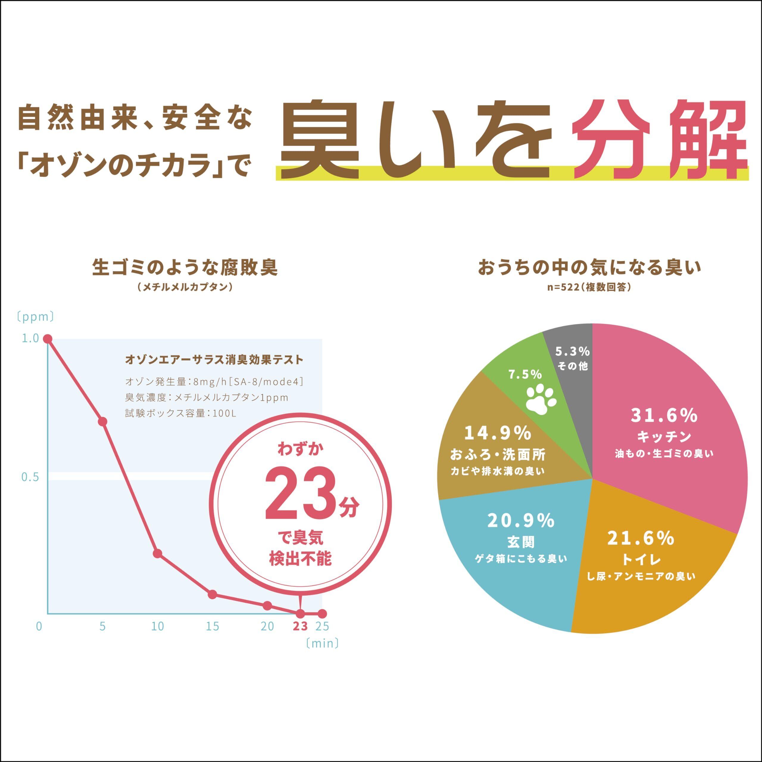 よくある質問(FAQ)空気は、生まれ変わる。<br>パワーアップしたオゾンのチカラで強力除菌&消臭。<br>さぁ、深呼吸しよう。<br>オゾンがつくるわたしの快適空間。<br>確かな品質と、長年の実績が生み出したオゾン発生量限界×突破!信頼の「メイド・イン・ジャパン」クオリティ!重さわずか220gの超軽量設計で壁掛けにも対応。<br>設置場所を選ばずミニマルでどんな空間にも自然にフィット。<br>最大12mg/hのオゾン発生量は小スペースから広範囲まで幅広く対応可能。<br>家族が寛ぐ自宅リビング、においが気になるトイレに加え、オフィスの会議室やデスクまわり、サロンやカフェといった対面で接客を伴う場などに幅広く活用できます。