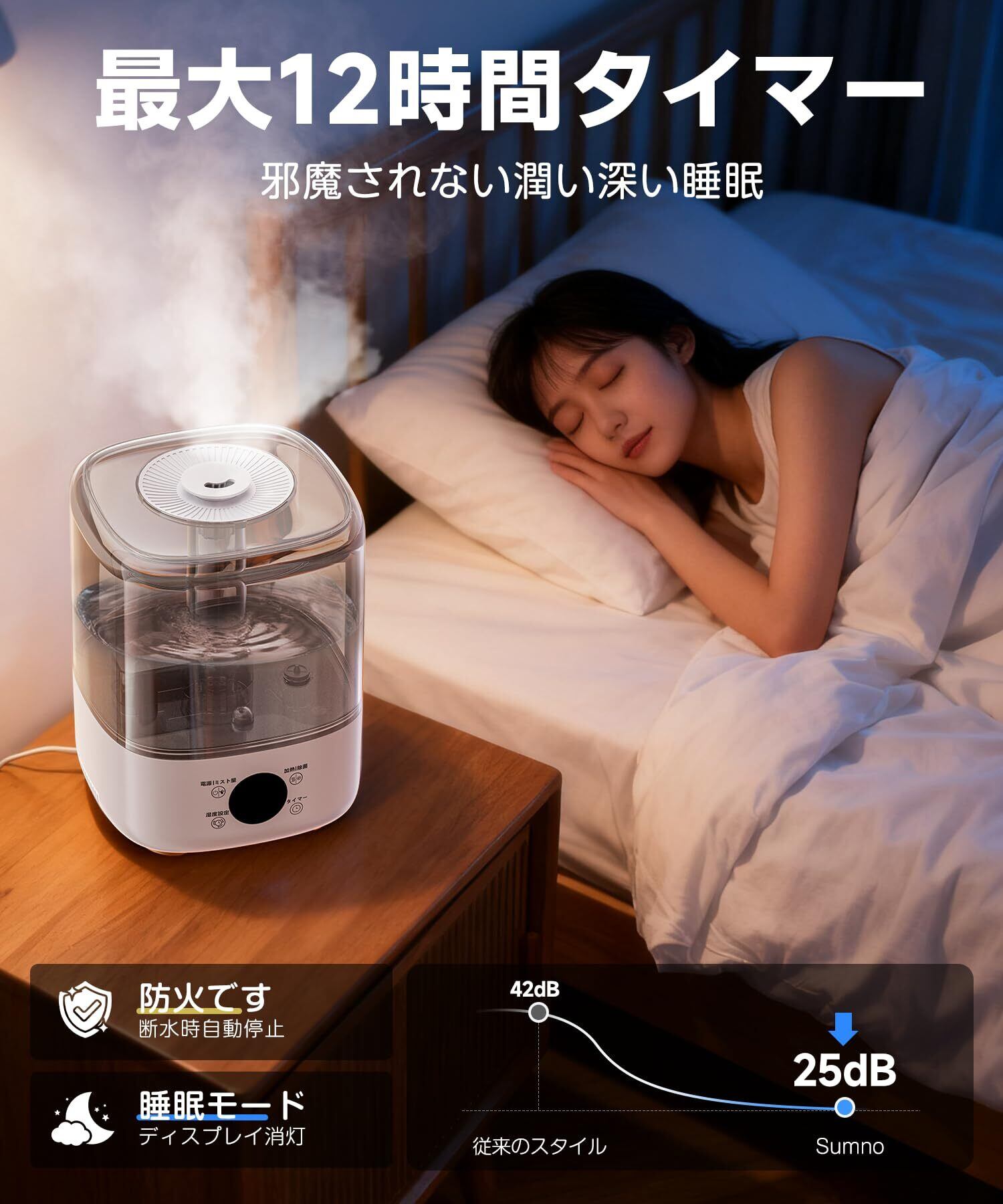【12時間タイマー&全方位安全設計で、子育て家庭も安心の日本品質】1時間単位で最大12時間までのタイマー設定が可能!消し忘れ防止と電気代の節約に役立ちます。水がなくなると自動で電源OFFになる「空焚き防止機能」 搭載で、安心してお使いいただけます。PSE認証を取得した日本国内対応の安全設計で、お子様やペットがいるご家庭でも安心。万が一のときも日本語対応のとサポートが付いているので、初めての方でもご安心ください!1.水量を智能検知。少なくなると音声で通知し自動OFF(ビープ音が5回鳴ります)。水を補充するだけで再開でき、機械の損傷や安全面でもご安心ください。2.なお、柔らかい床やカーペット、あるいは平らでない場所でのご使用はお控えください。3.ご利用時間の目安をお守りください。過加湿による床や家具の濡れを防ぎ、快適な環境をお守りします。