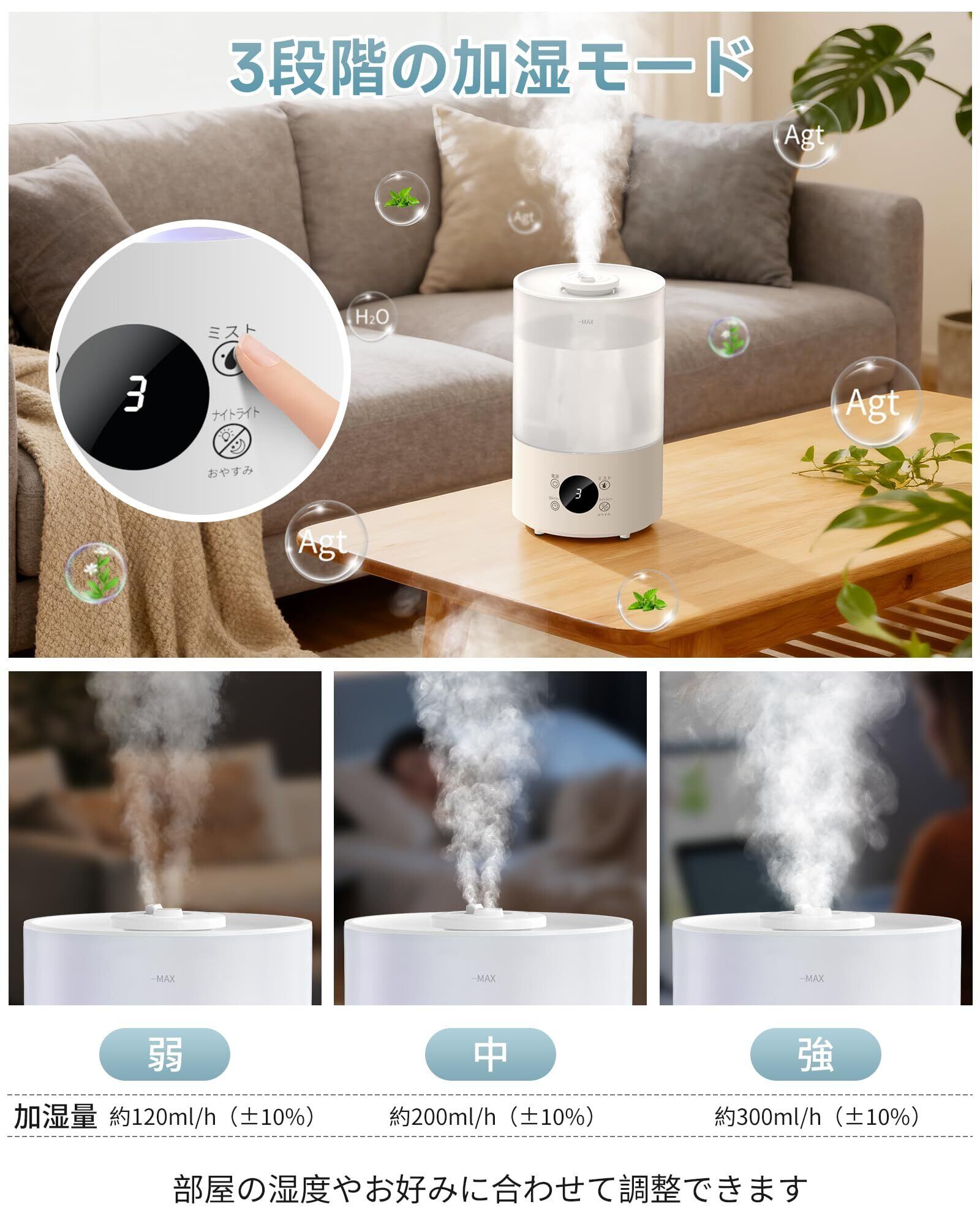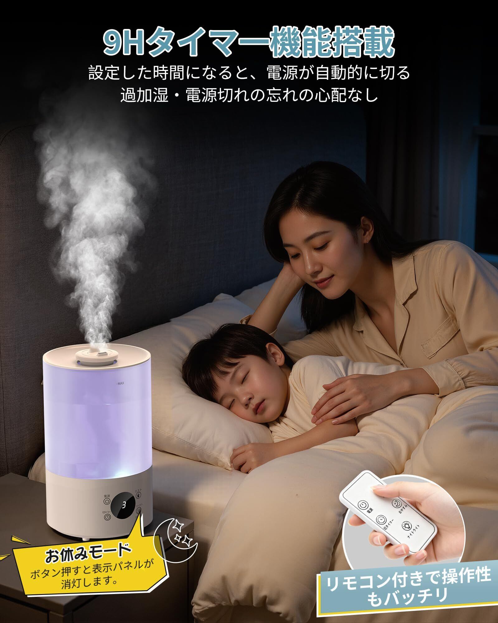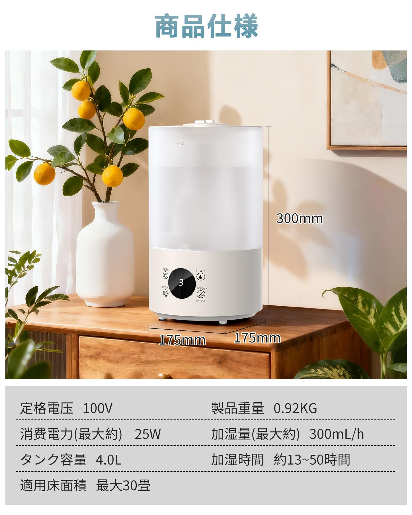 【4.0L大容量&最大50時間連続作動】水タンクが4.0L大容量で、満タンにすれば、最大約50時間の連続運転が可能です。頻繁に給水する必要がなく、部屋が広いや使用時間が長い場合にピッタリです。就寝時に切れてしまう心配もありません。さらに加湿量の無段階調整が可能です。風邪、鼻やのどが乾燥、静電気が発生、アレルギーなど、秋、冬季節に最適です。